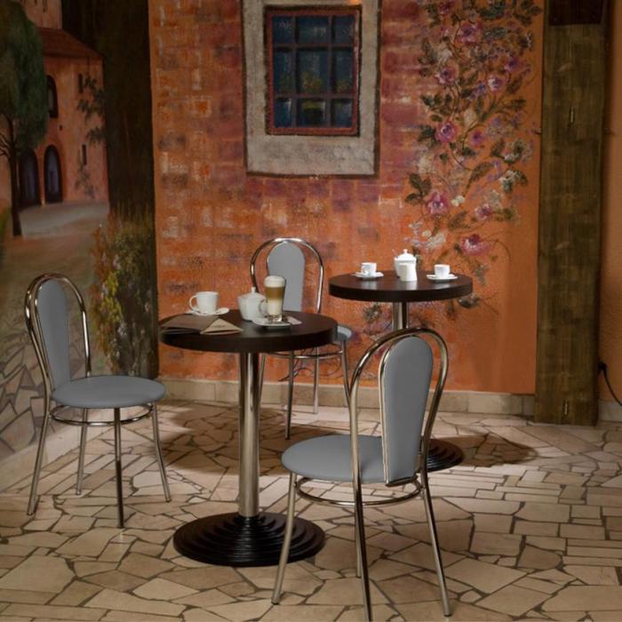 Stelaż krzesła został wykonany z metalu, natomiast siedzisko tapicerowane jest ekoskórą. Wysokość do siedziska wynosi 47 cm.