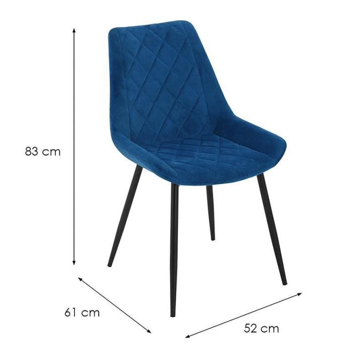 Stelaż krzesła został wykonany z metalu, natomiast siedzisko tapicerowane jest tkaniną. Wysokość do siedziska wynosi 45 cm.