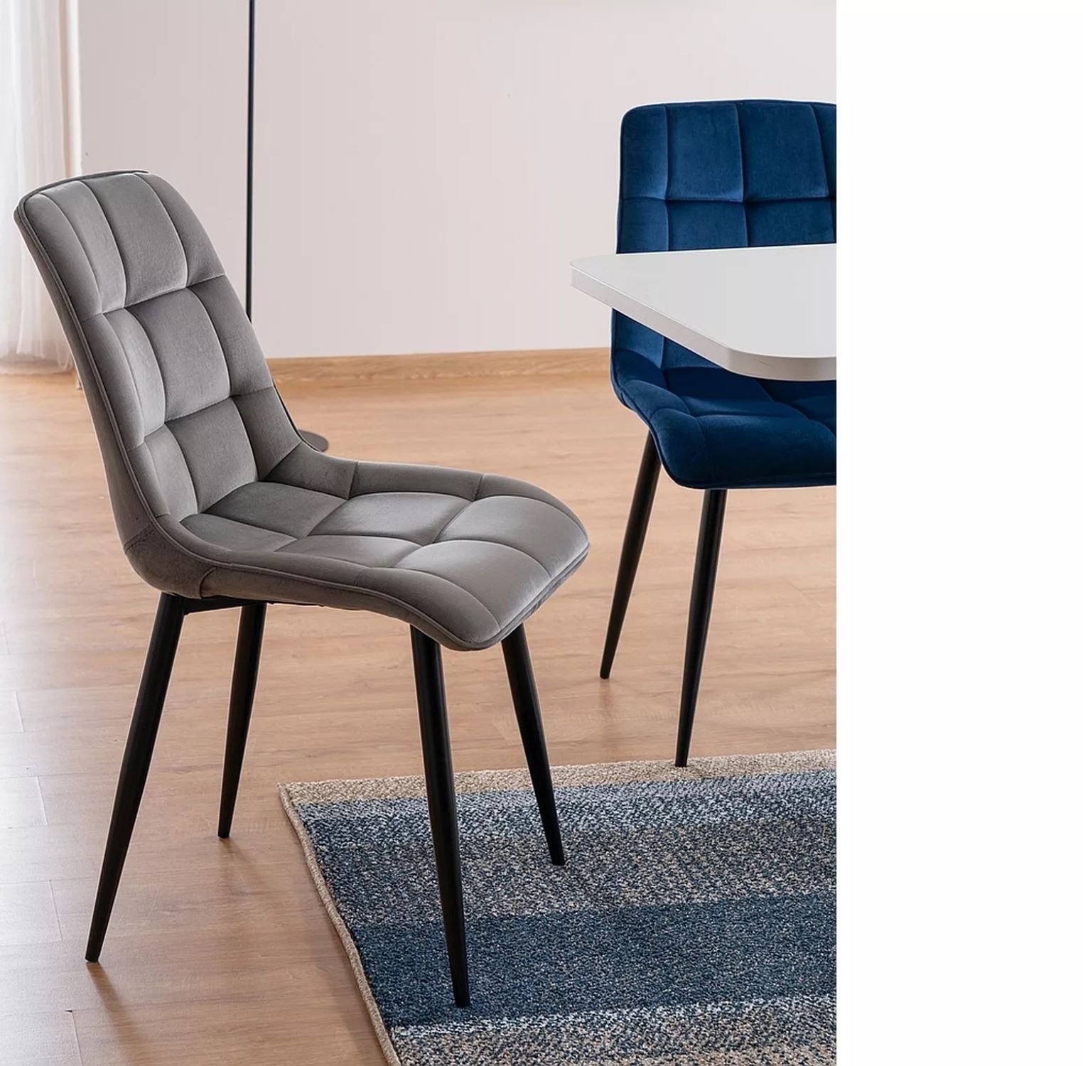 Krzesło Viva to połączenie wygody, estetyki i solidności. Tapicerowane tkaniną aksamitną Bluvel w kolorze popielatym, ozdobione wciągami i przeszyciami, to mebel, który doda Twojemu wnętrzu nowoczesnego charakteru. Stelaż metalowy w kolorze czarnym zapewnia trwałość i stabilność. Wybierz krzesło Viva, aby cieszyć się nie tylko komfortem, ale również pięknem we własnym domu lub biurze.