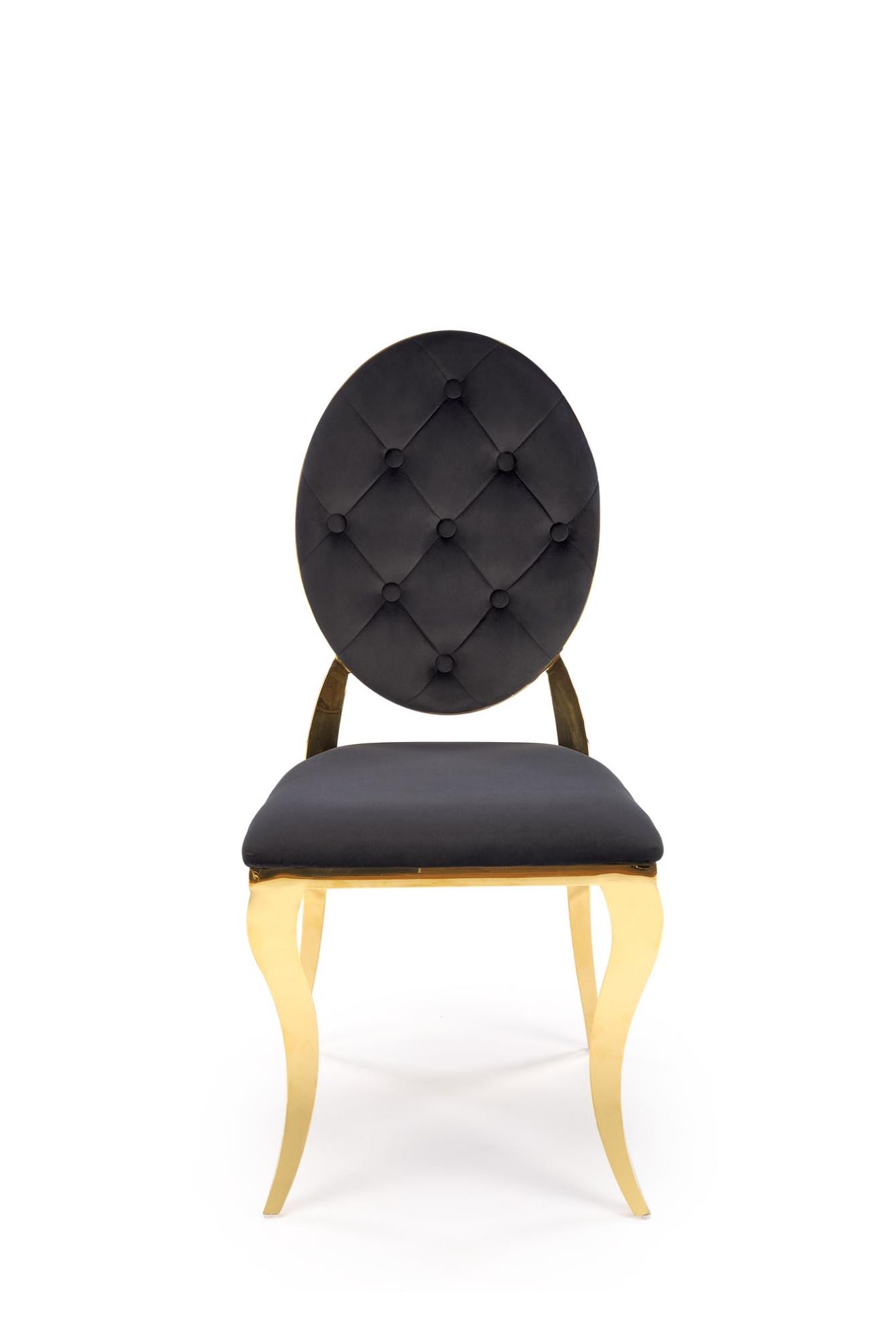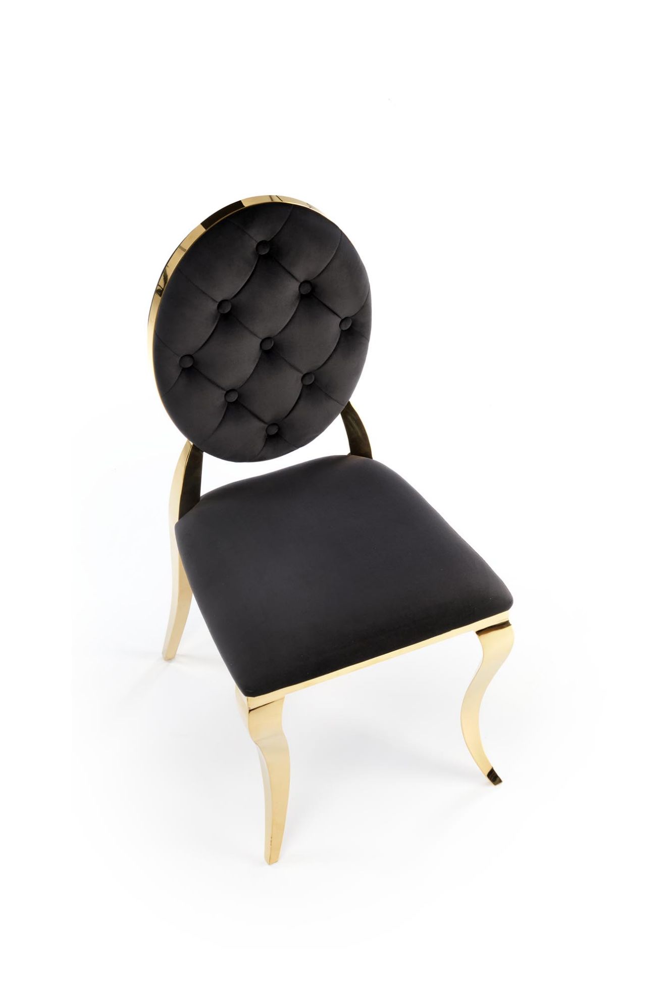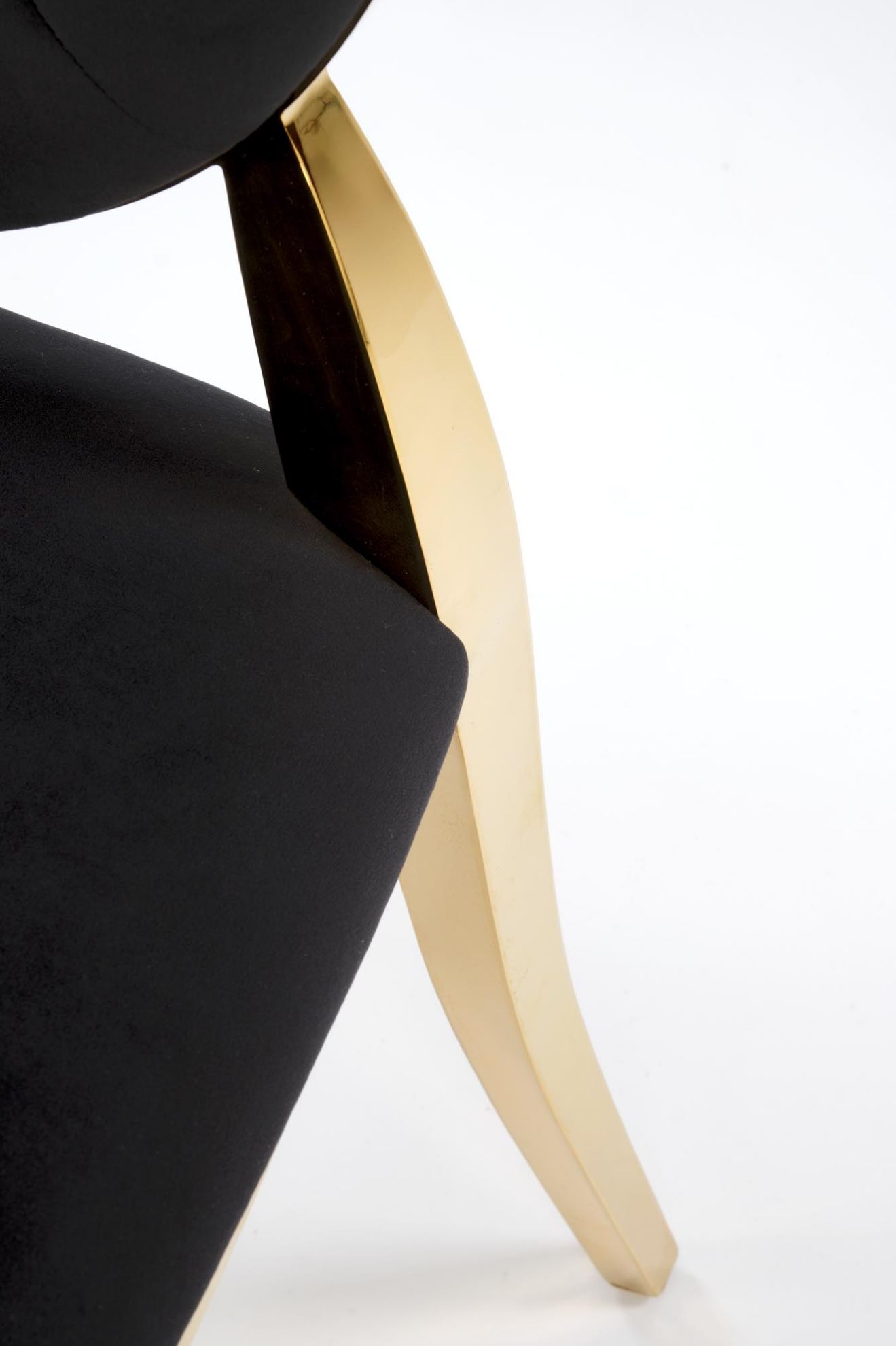 Obite miękką tkaniną velvet BLUVEL#19 w czarnym kolorze, krzesło emanuje elegancją i wyrafinowaniem. Złote, stalowe nogi wykonane ze stali nierdzewnej dodają mu nowoczesnego charakteru i trwałości, tworząc harmonijne połączenie z welurowym obiciem.