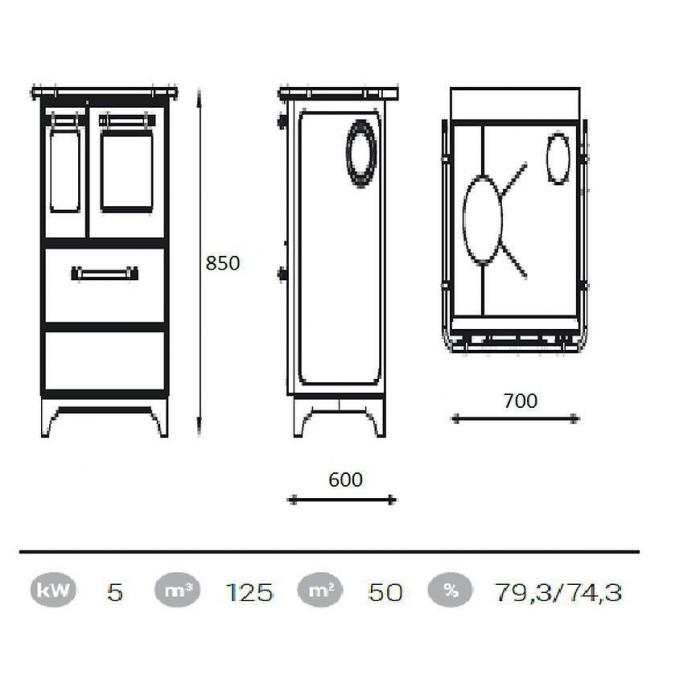 Kuchenka Donna 70 to nie tylko praktyczne urządzenie do gotowania i ogrzewania, to także element aranżacyjny, który nadaje charakteru przestrzeni kuchennej. Podłączenie do komina od lewej strony i do góry gwarantuje nie tylko łatwość instalacji, ale także zintegrowane korzystanie z obu funkcji pieca.