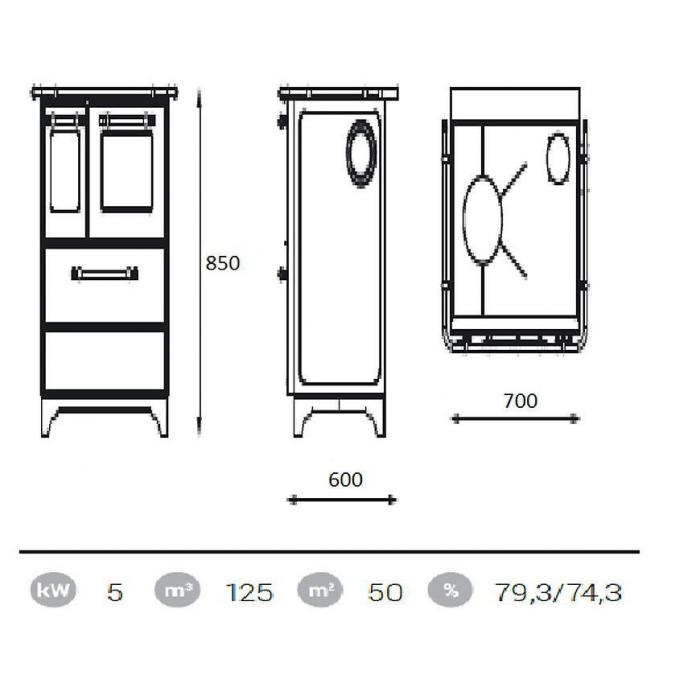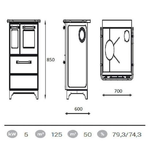 Podłączenie do komina od prawej strony i do góry to elastyczność instalacyjna, umożliwiająca dostosowanie kuchenki Donna 70 do różnych warunków aranżacyjnych i strukturalnych pomieszczenia.