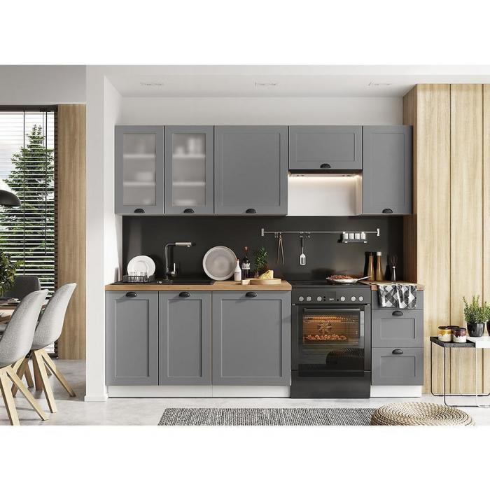 Zestaw jest świetnym rozwiązaniem, pozwoli przeprowadzić nawet szybką metamorfozę. Kolekcja obejmuje zarówno szafki z otwieranymi, uchylnymi drzwiami oraz szafki wyposażone w szuflady - zarówno jedne i drugie znajdują swoje zastosowanie w kuchni.