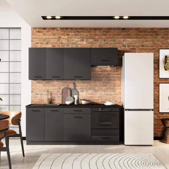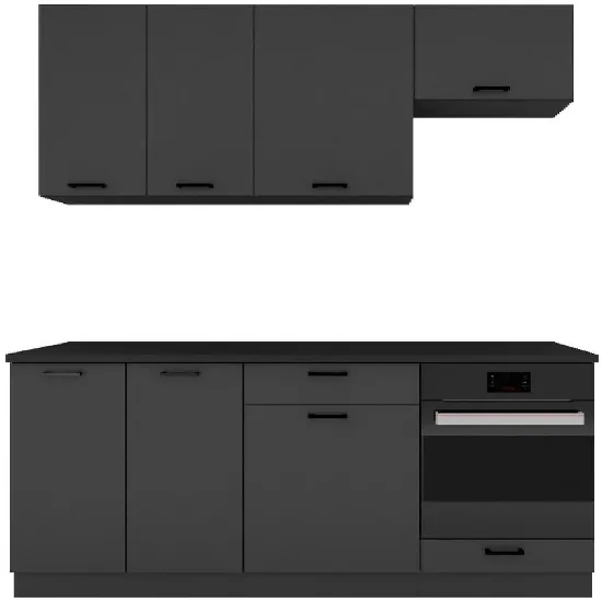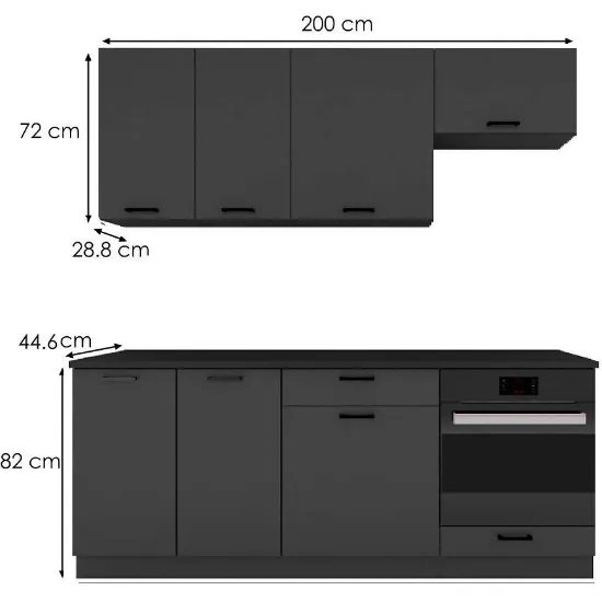 Kuchnia Anika to zestaw kuchenny o szerokości 200 cm, który idealnie sprawdzi się w nowoczesnych wnętrzach. Prosty układ szafek oraz matowe wykończenie frontów w kolorze grafitowym nadaje pomieszczeniu elegancki i spójny wygląd. Zestaw został wykonany z wysokiej jakości materiałów, które łączą estetykę z trwałością, a jednocześnie gwarantują wygodę codziennego użytkowania.