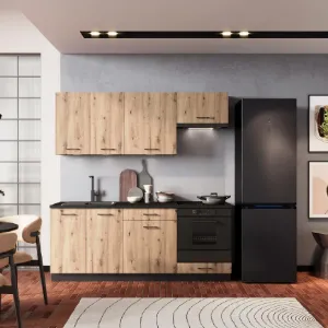 Fronty wykonane z płyty laminowanej w wykończeniu matowym są odporne na zarysowania i łatwe w utrzymaniu czystości. Dolne i górne fronty w jasnym drewnopodobnym wybarwieniu artisan wprowadzają naturalny akcent do wnętrza. Korpus z płyty wiórowej laminowanej w kolorze grafitowym zapewnia solidną konstrukcję i stabilność całego zestawu.