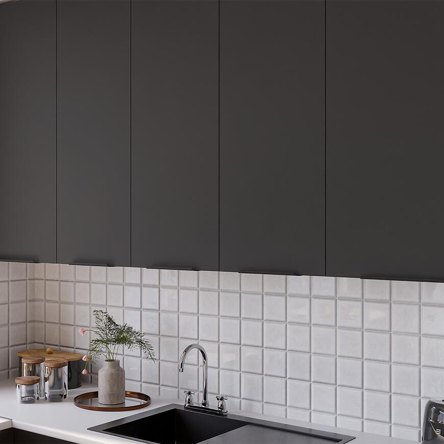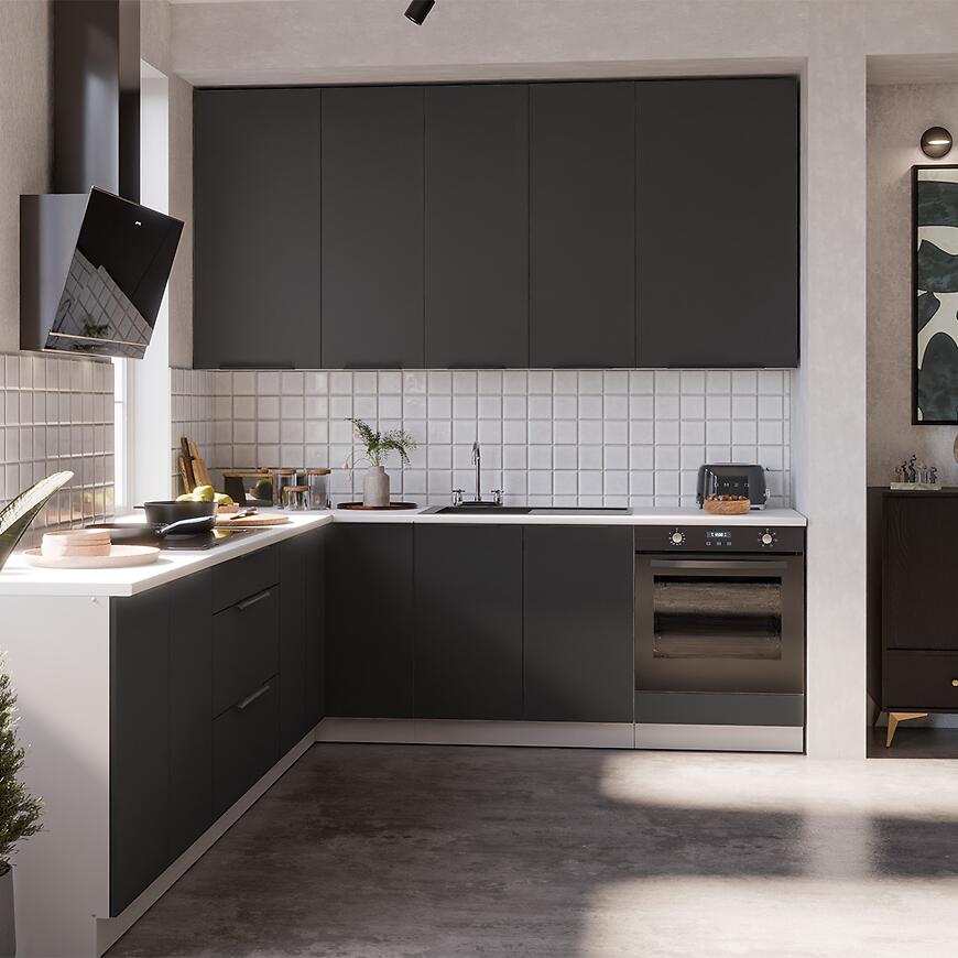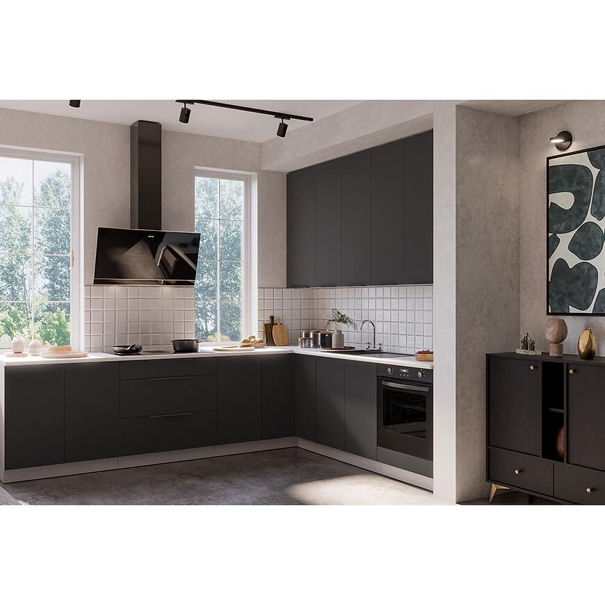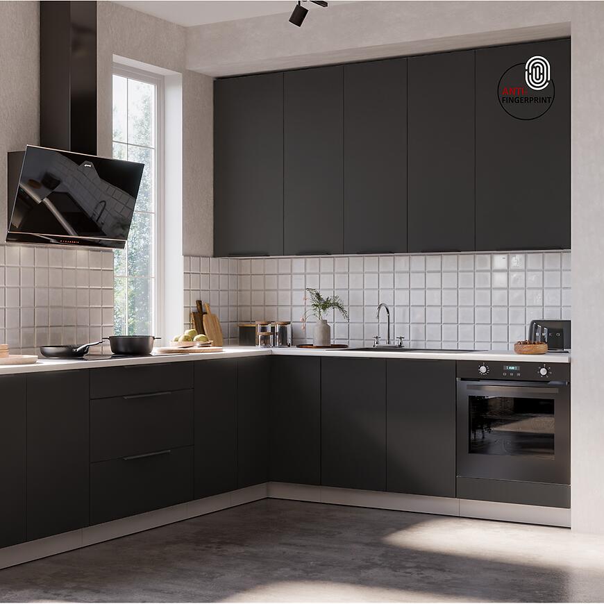 Fronty szafek, zarówno górnych jak i dolnych, wykonane są z laminowanej płyty wiórowej i wykończone w matowej czerni (black AFM), co nadaje kuchni nowoczesny i elegancki charakter. Korpusy szafek są w kolorze białym, również w wykończeniu matowym, co tworzy subtelny kontrast z frontami i optycznie rozjaśnia przestrzeń. Dolne szafki posiadają cokół w kolorze korpusu, który zapewnia estetyczne wykończenie i stabilność całego zestawu.