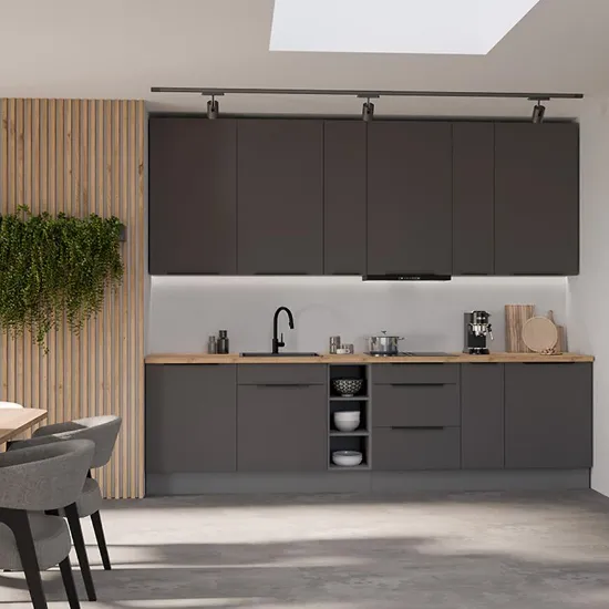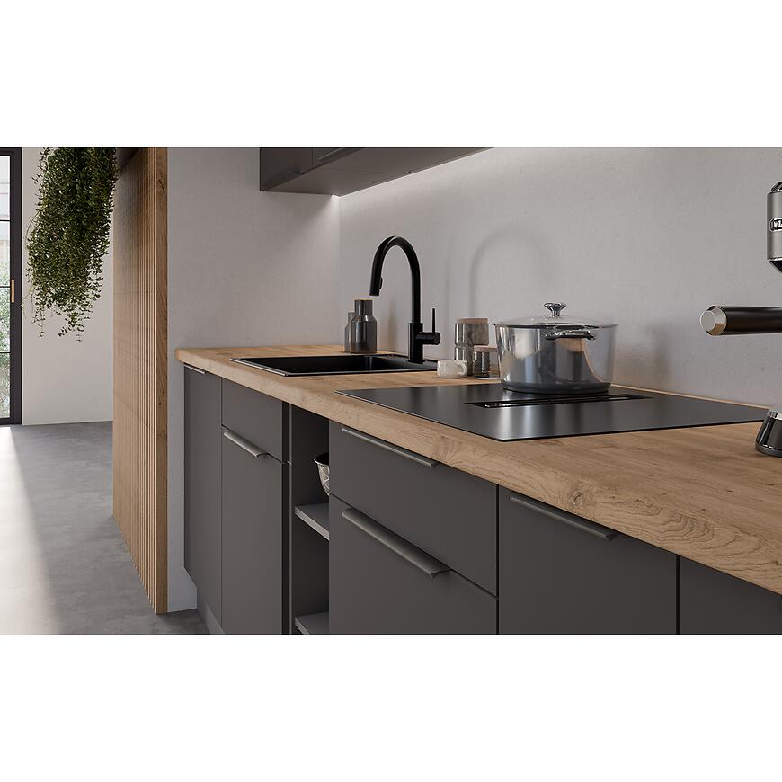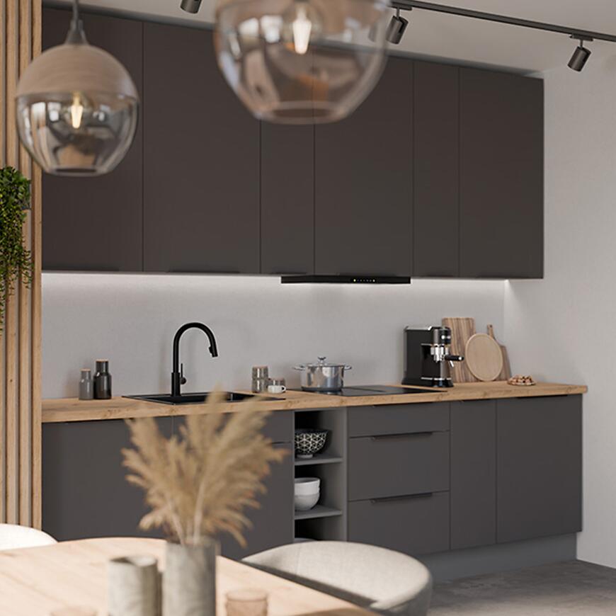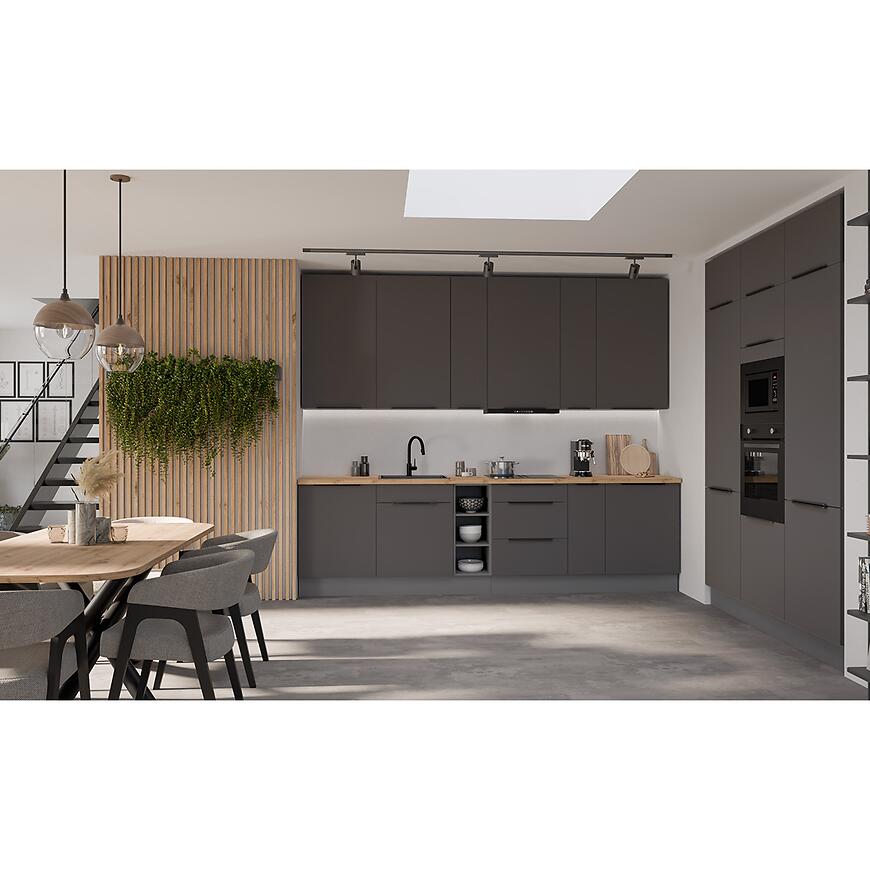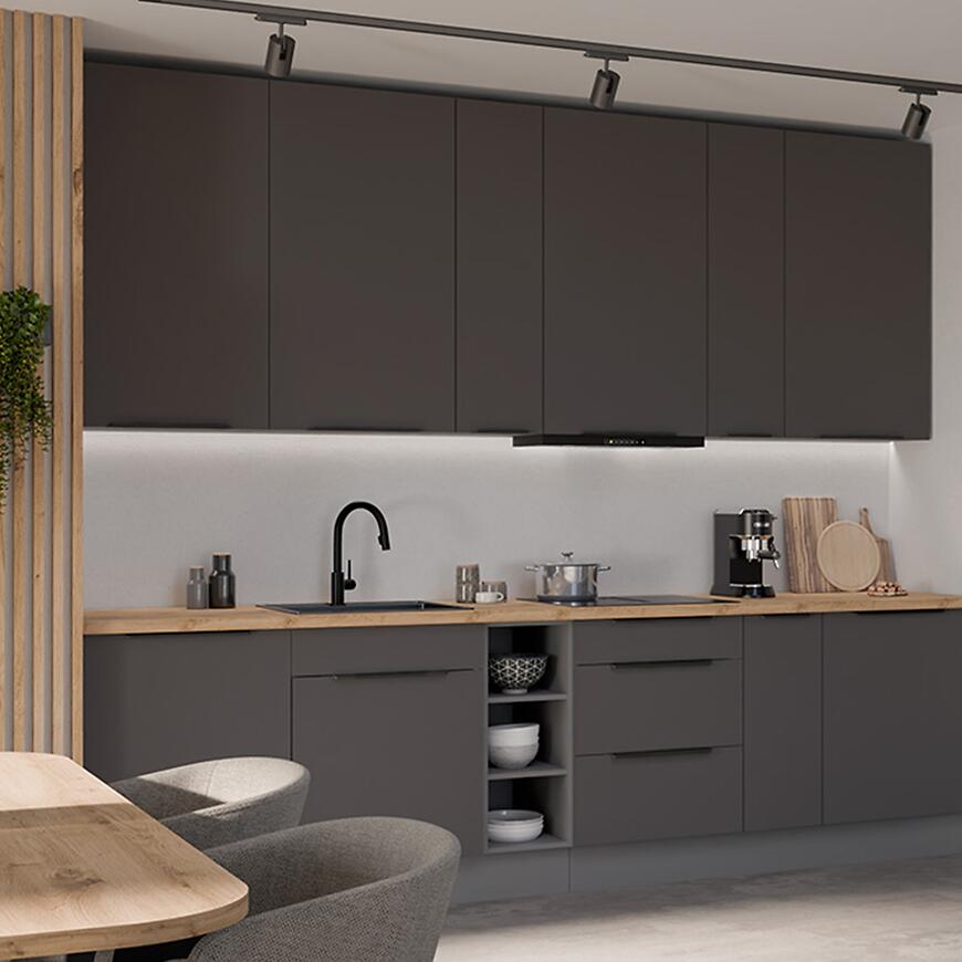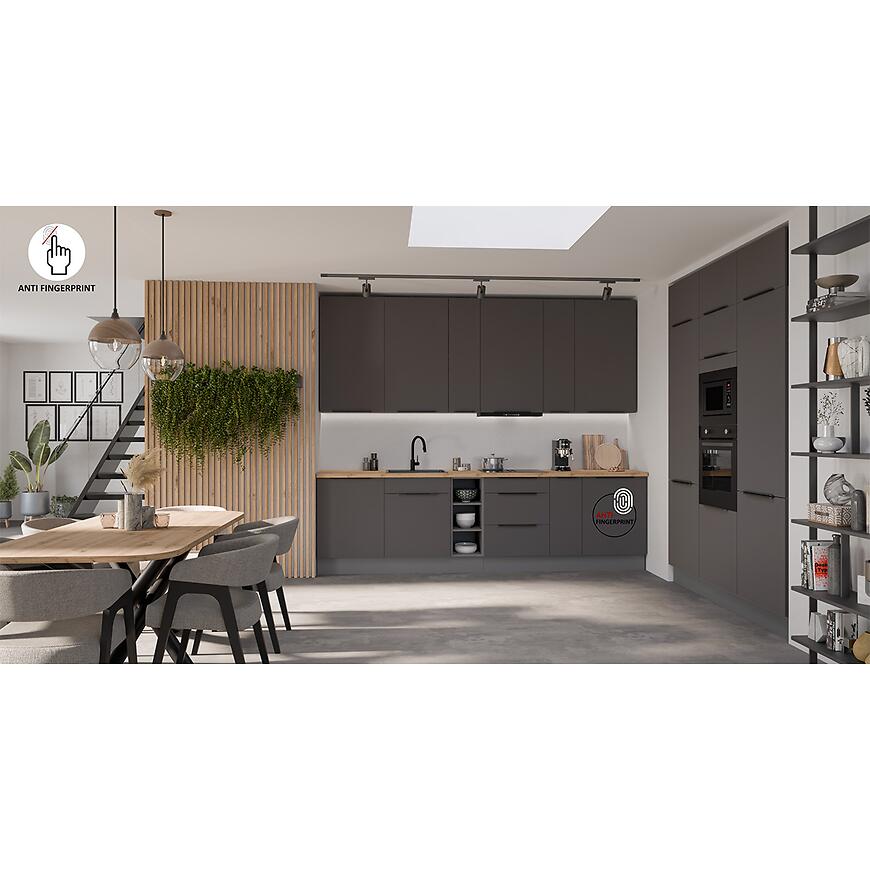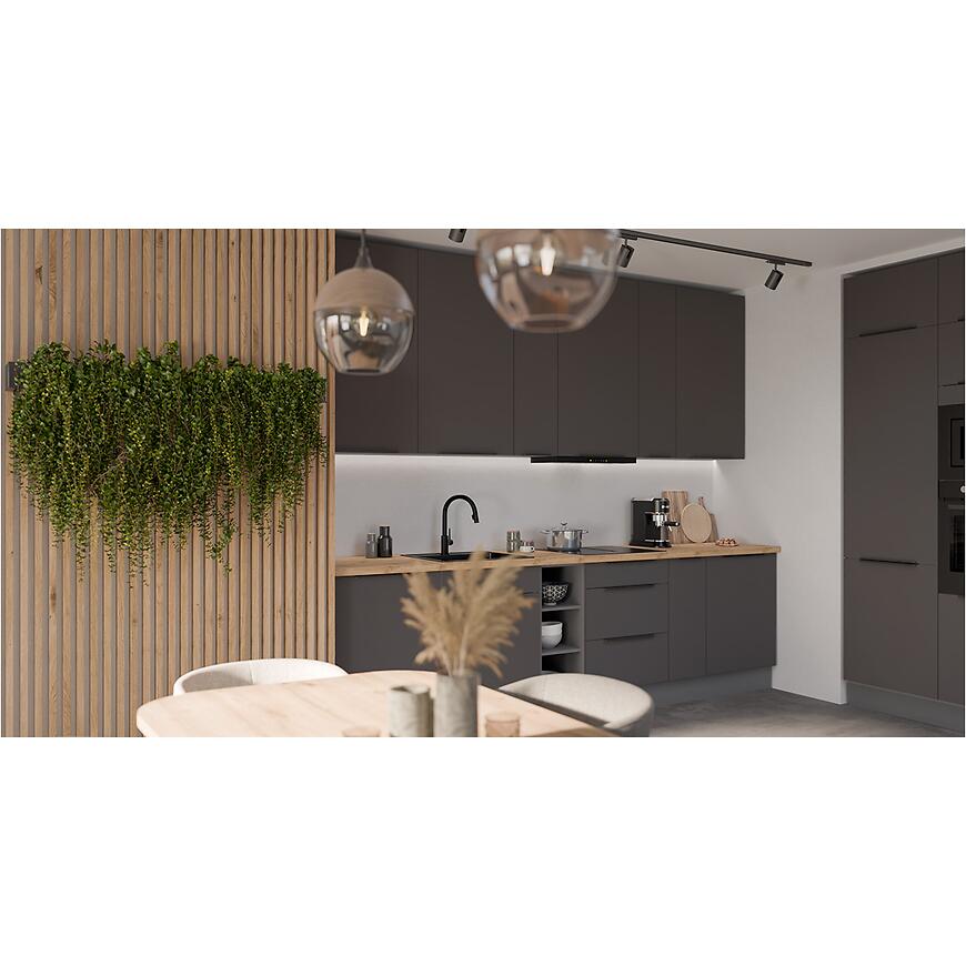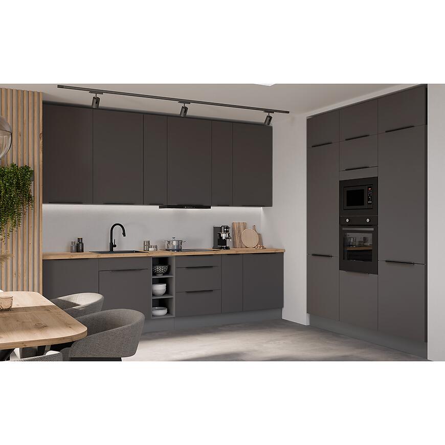 Fronty szafek, zarówno górnych, jak i dolnych, wykonane są z laminowanej płyty wiórowej w eleganckim grafitowym kolorze (graphite AFM) z matowym wykończeniem, które podkreśla nowoczesny charakter kuchni i dodaje jej wyrafinowanego stylu. Korpusy szafek mają kolor antracytowy, również w matowym wykończeniu, co tworzy subtelny kontrast z frontami i harmonijnie współgra z całością.