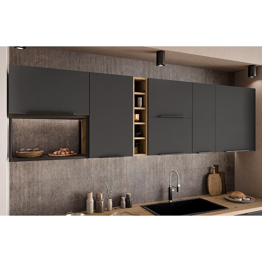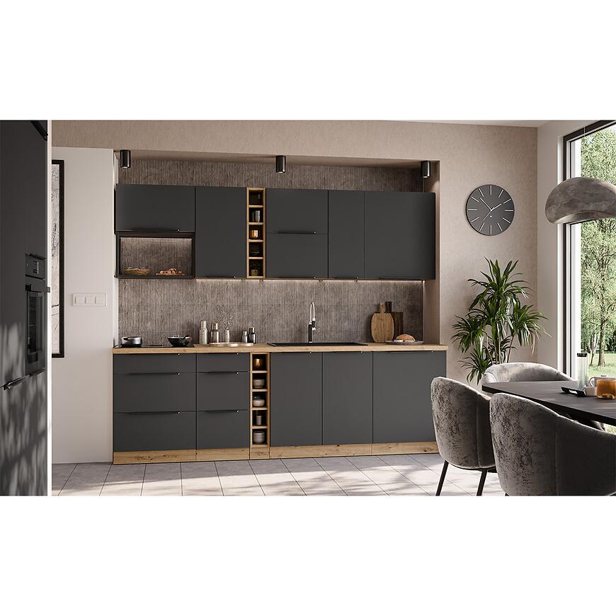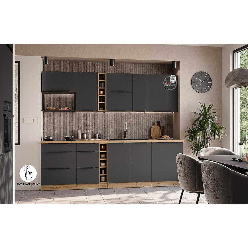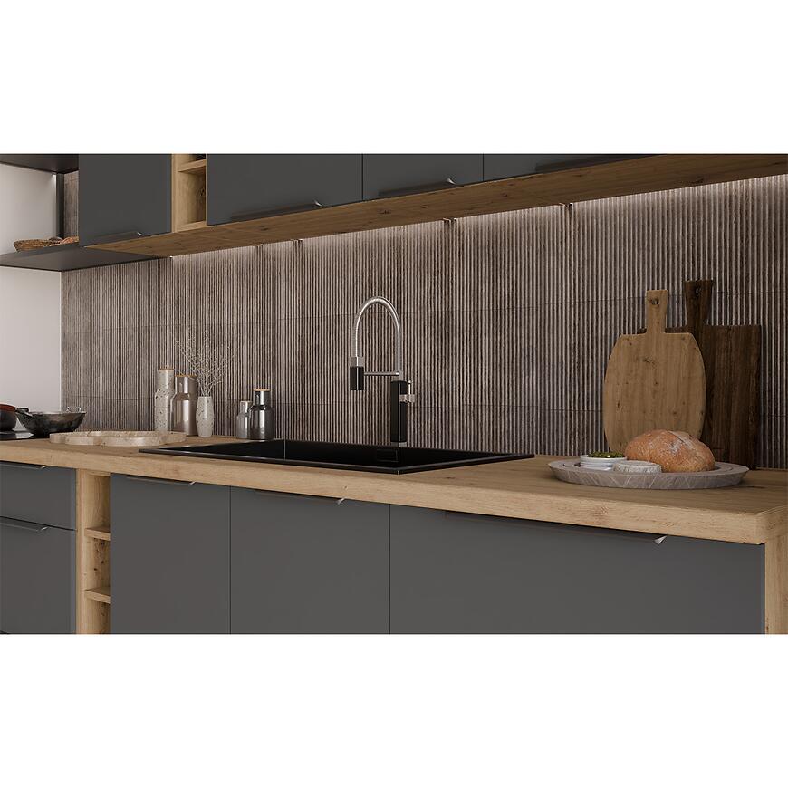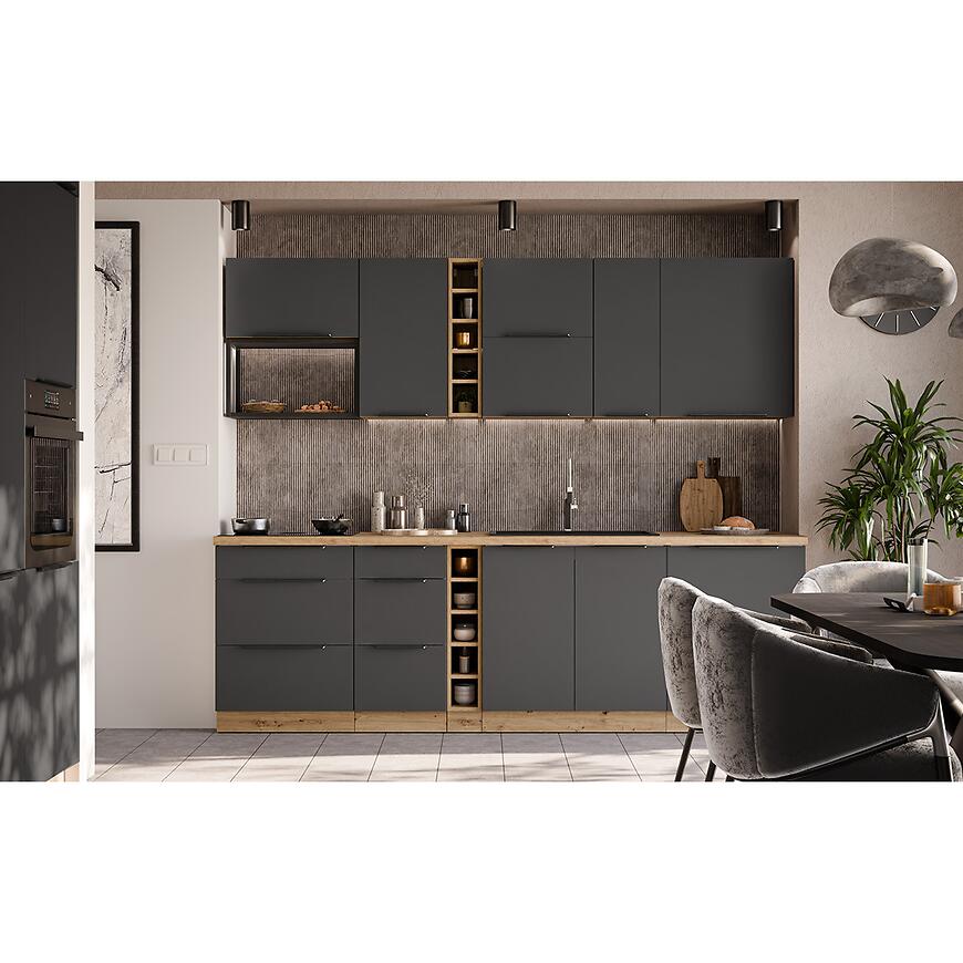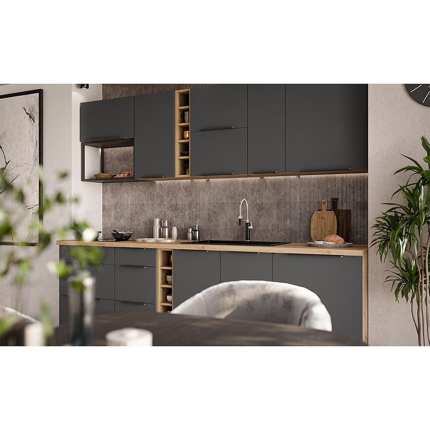 Kuchnia Aria GR/AR 255 cm to nowoczesny, prosty zestaw mebli kuchennych, który łączy w sobie elegancki design z funkcjonalnością i przemyślanym rozplanowaniem przestrzeni. Jej minimalistyczny styl doskonale wpisuje się w różne aranżacje wnętrz, a kontrast pomiędzy grafitowymi frontami (graphite AFM) a jasnym, drewnopodobnym korpusem (dąb artisan) nadaje kuchni nowoczesnego, subtelnego charakteru.