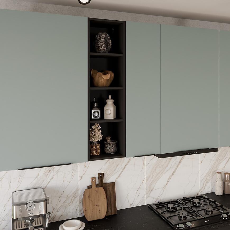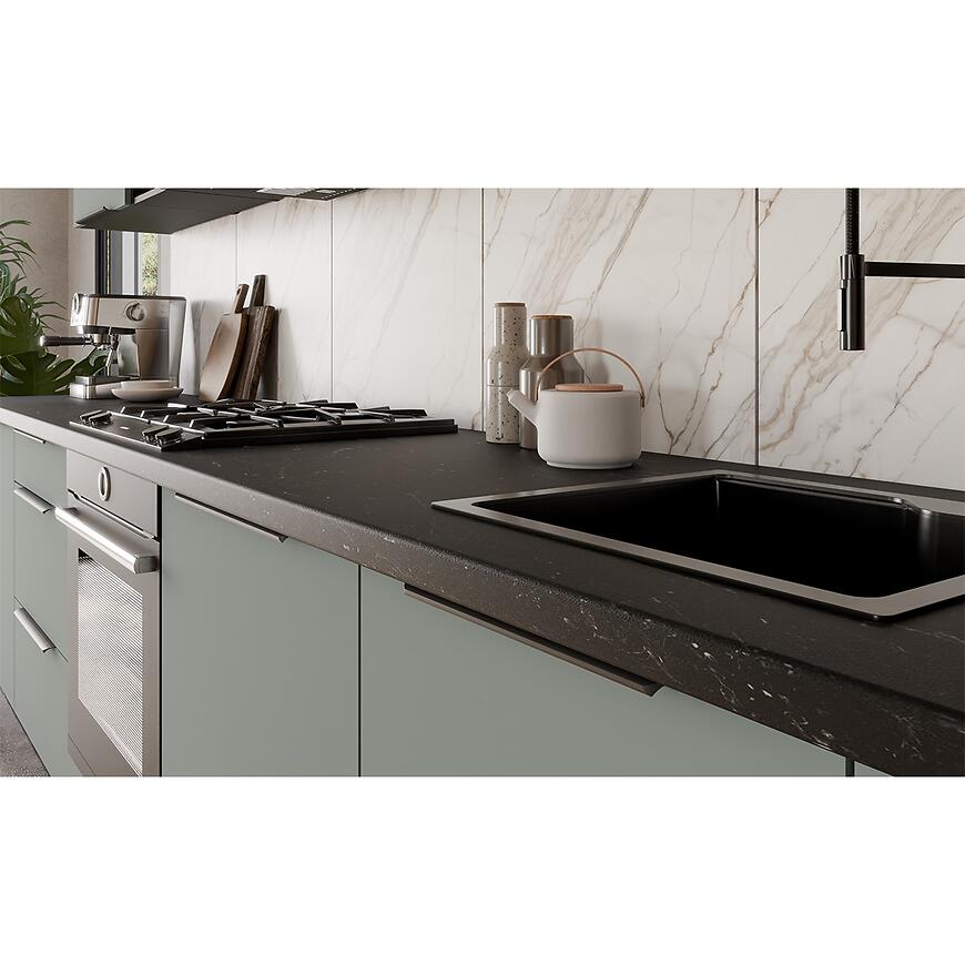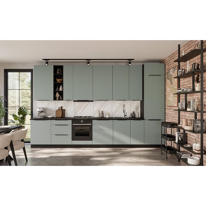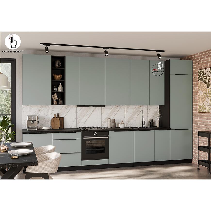 Kuchnia Aria SA/BL 390 cm to wyjątkowo przestronny i funkcjonalny zestaw kuchenny, który doskonale sprawdzi się w dużych pomieszczeniach. Jej głównym atutem jest połączenie intensywnego, zielonego odcienia aquamarine AFM na frontach z eleganckim, czarnym korpusem, co tworzy nowoczesny, odważny kontrast i nadaje wnętrzu charakteru. Matowe wykończenie frontów oraz korpusu podkreśla minimalistyczny styl i ułatwia utrzymanie powierzchni w czystości.