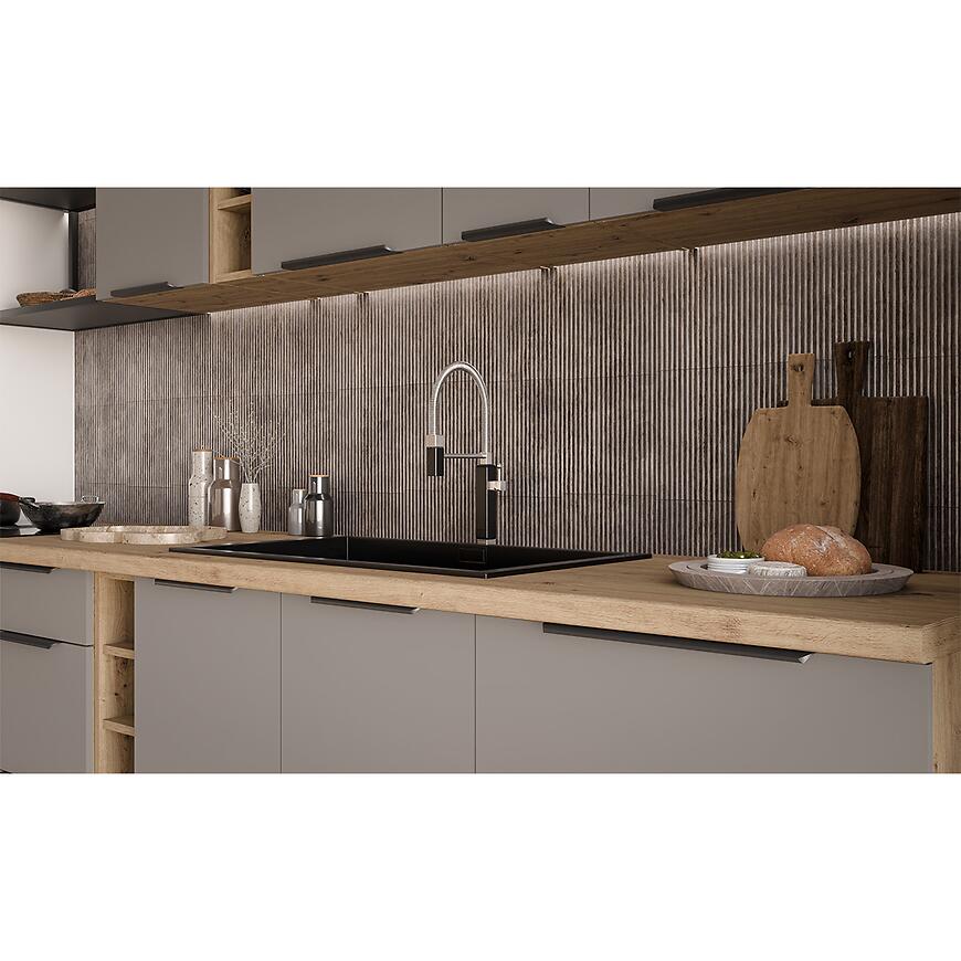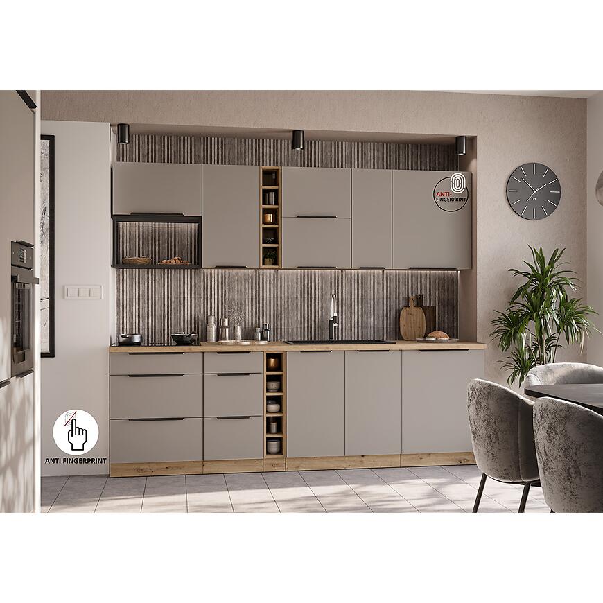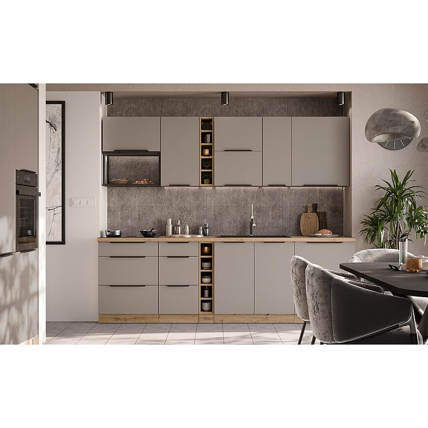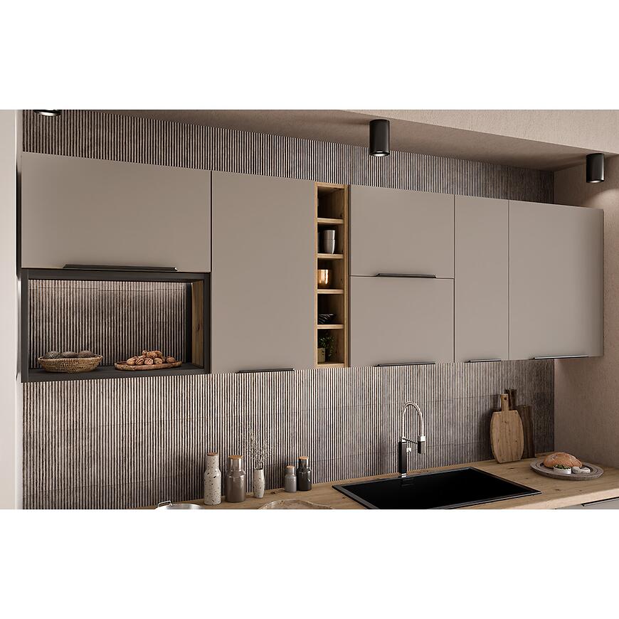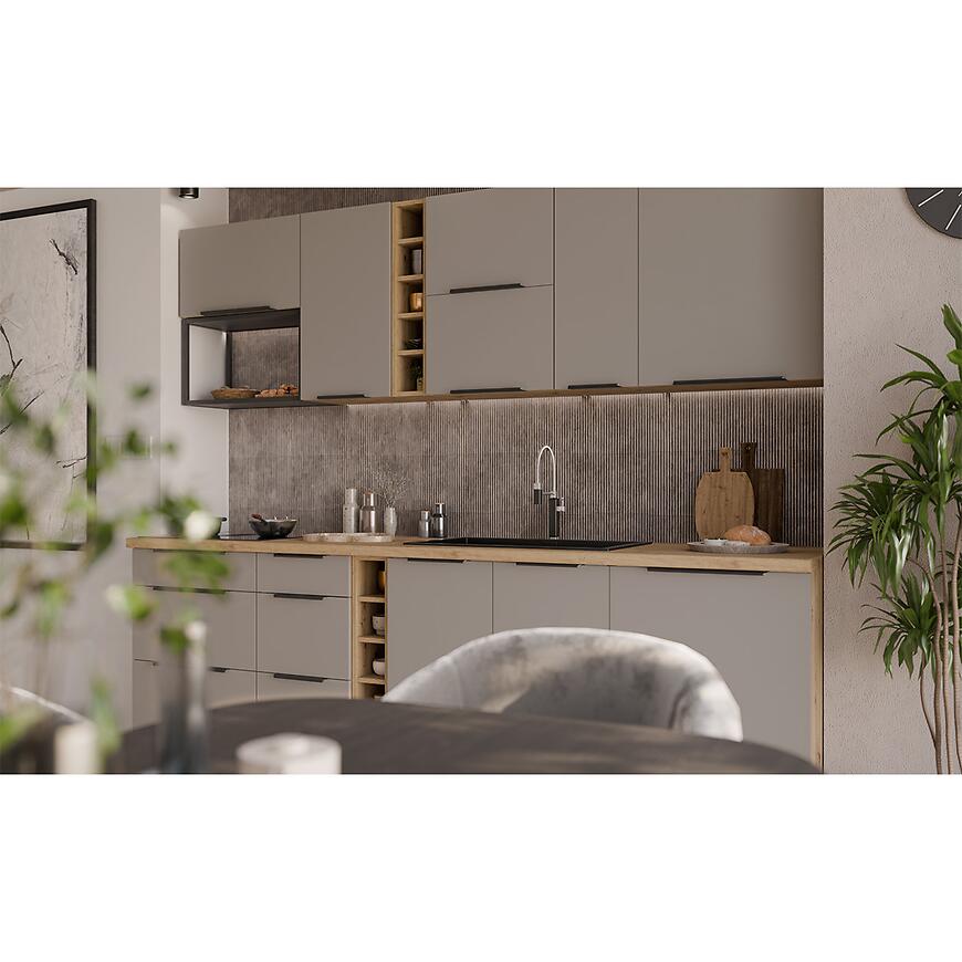 Kuchnia Aria TA/AR 255 cm to funkcjonalny zestaw kuchenny o klasycznej, prostokątnej formie, który łączy elegancję z wygodą użytkowania. Fronty w ciepłym beżowym odcieniu sandgrau AFM nadają wnętrzu przytulności i sprawiają, że kuchnia staje się jasnym, przyjaznym miejscem do gotowania i spotkań. Matowe wykończenie frontów i korpusu ułatwia utrzymanie czystości oraz podkreśla nowoczesny charakter mebli.