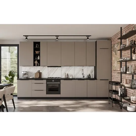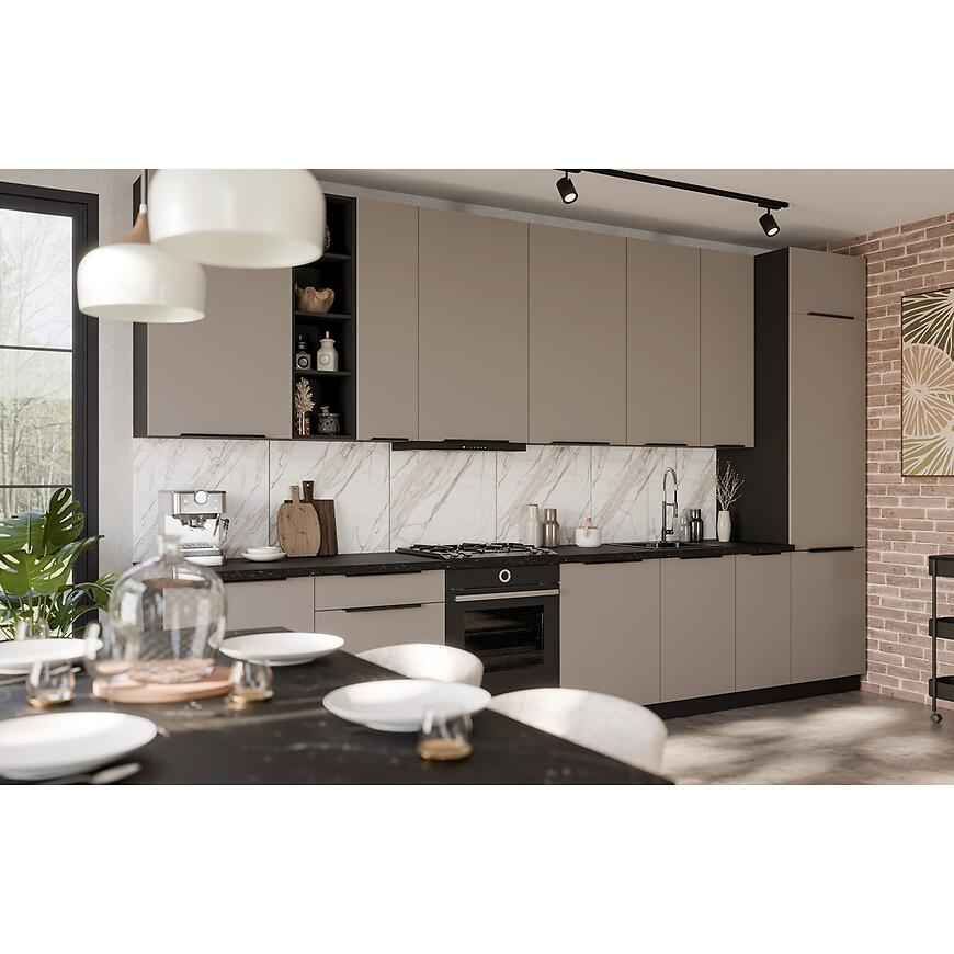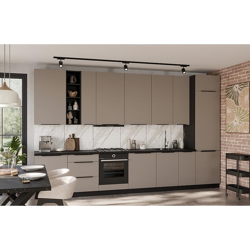 Kuchnia Aria TA/BL 390 cm bez blatu to szeroki zestaw kuchenny zaprojektowany z myślą o funkcjonalności i nowoczesnym designie. Zestaw o łącznej szerokości 390 cm tworzy spójną i elegancką aranżację w kuchniach prostych. Matowe fronty szafek górnych i dolnych w kolorze sandgrau w połączeniu z beżowym wybarwieniem nadają kuchni harmonijny i stylowy wygląd. Czarny korpus z matowym wykończeniem podkreśla nowoczesny charakter mebli, tworząc efektowny kontrast.