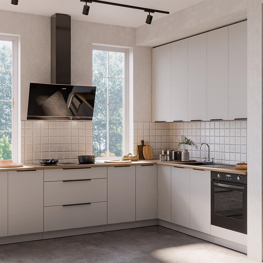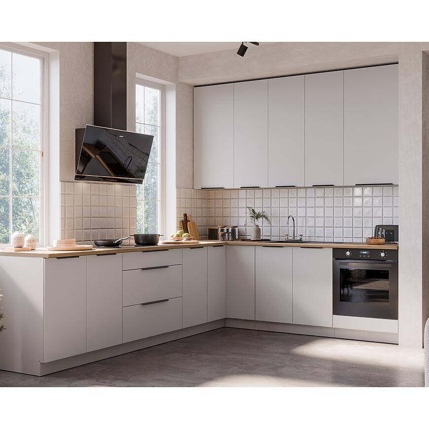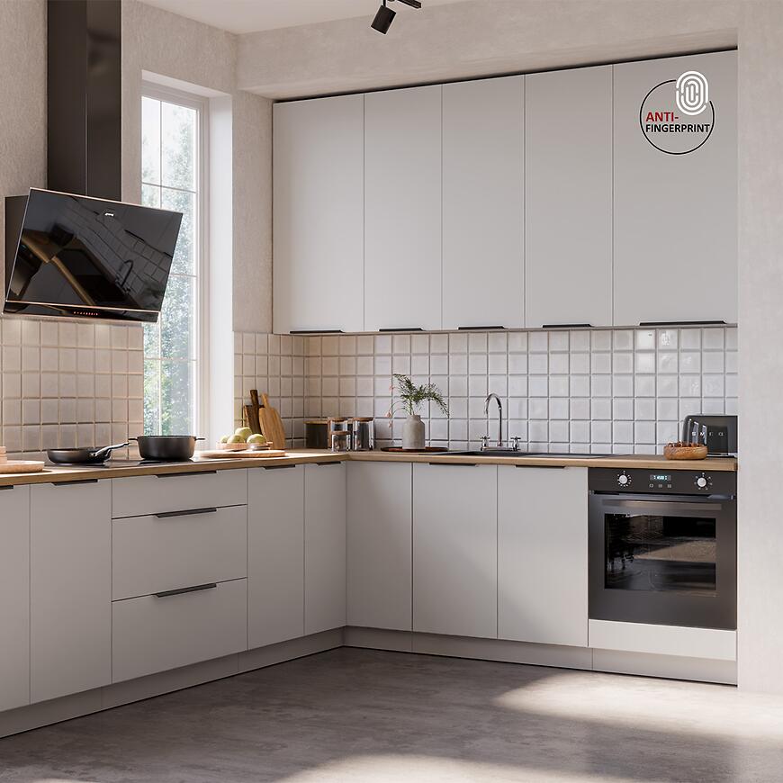 Fronty i korpus wykonane z płyty wiórowej laminowanej gwarantują odporność na uszkodzenia i łatwe utrzymanie czystości. Matowe wykończenie podkreśla nowoczesny charakter zestawu i sprawia, że kuchnia idealnie wpisuje się w styl minimalistyczny, skandynawski lub loftowy.