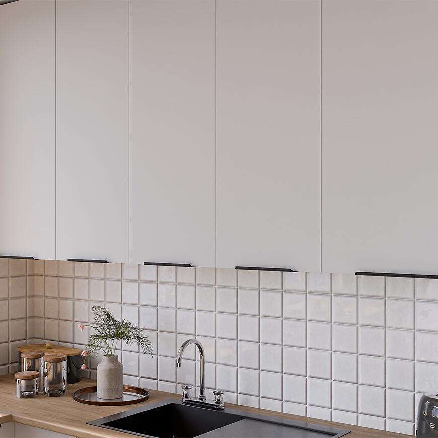 Cokół w kolorze korpusu i uchwyty w zestawie ułatwiają codzienne użytkowanie, a system cichego domyku frontów zwiększa komfort pracy w kuchni, zapewniając płynne i bezgłośne zamykanie szafek.