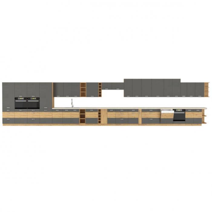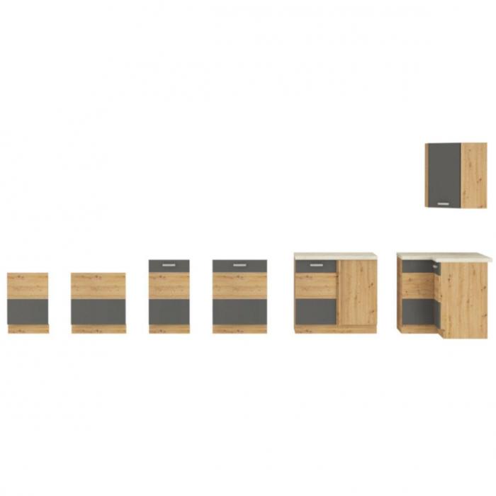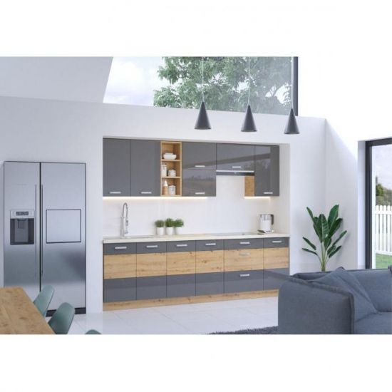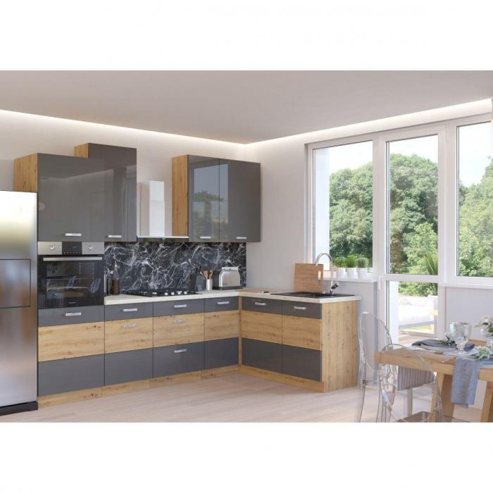 Kuchnia Artisan Szary to zestawienie nowoczesnego szarego połysku z nutą dąbu artisan. Dla wiekszego komfortu zastosowano w szufladach system cichego domyku Indamatic. Również we frontach jest system cichego domyku. Szafki posiadają plastikowe uchwyty wykonane z PCV. Fronty kuchenne wykonane w zestawie są z płyty MDF o grubości 16mm w kolorze szarym z połyskiem oraz wzmocnione obrzeżem ABS. Korpus kuchni wykonany jest natomiast z płyty laminowanej w kolorze dąb artisan o grubości 16mm. Zestaw kuchni Artisan jest bardzo funkcjonalny.