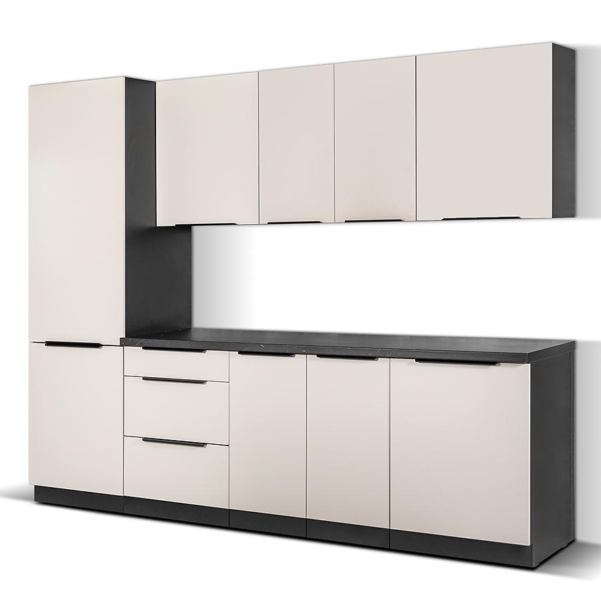 Wybarwienie beżowych frontów harmonijnie komponuje się z czarnym korpusami, tworząc spójną i elegancką całość. Meble kuchenne Arona to doskonały wybór dla tych, którzy cenią sobie zarówno funkcjonalność, jak i estetykę w swojej kuchni.