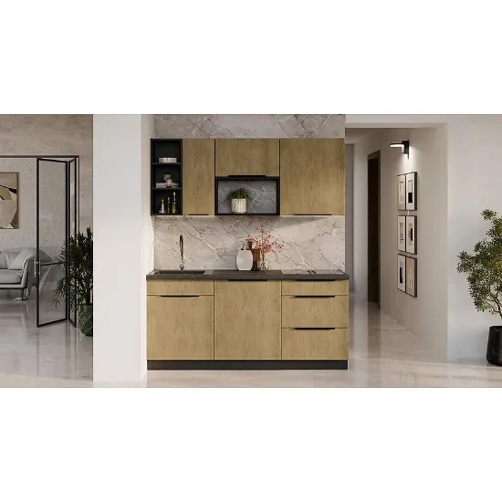 Zestaw pasuje do nowoczesnych aranżacji kuchennych, a kontrast między jasnym drewnem frontów a czarnym korpusem dodaje wnętrzu wyrazistości i stylu. Można go łatwo dopasować do różnych blatów, zlewozmywaków i sprzętu AGD, tworząc spójną i funkcjonalną przestrzeń kuchenną.