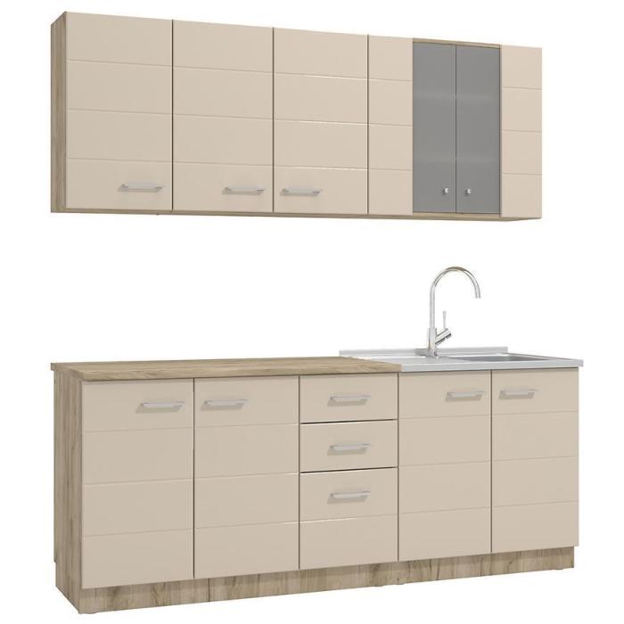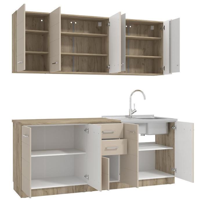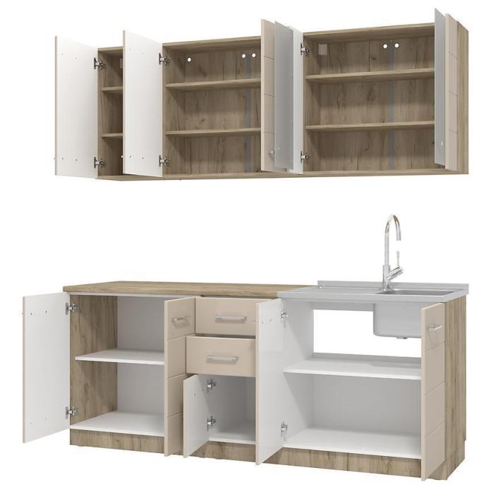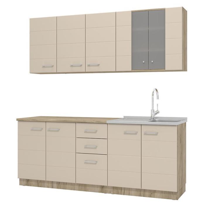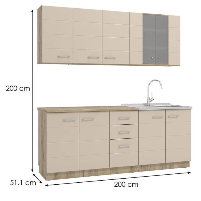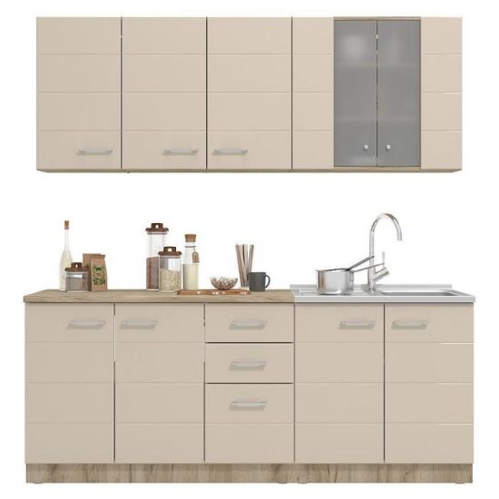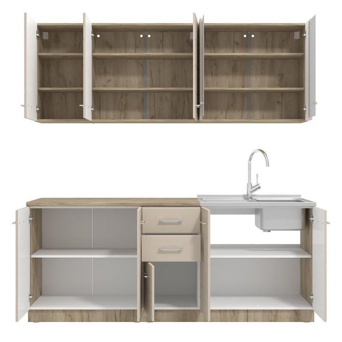 W zestawie zastosowano proste, lekkie bryły, dzięki czemu kuchnia nabiera eleganckiego charakteru i wydaje się też być bardziej przestronna. Gotowy zestaw mebli kuchennych to dobry sposób na estetyczne, szybkie i funkcjonalne umeblowanie kuchni. Zestaw obejmuje górne i dolne szafki kuchenne wykonane z wysokiej jakości trwałych materiałów, co podczas użytkowania jest bardzo ważne.