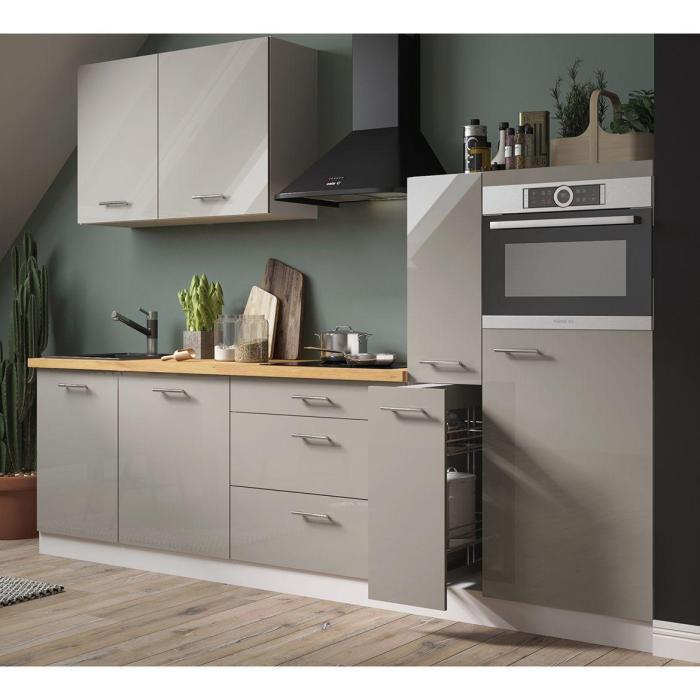 Kuchnia Essen - zestaw w jasnej i ciepłej kolorystyce nada wnętrzu nowoczesności, ale sprawi także, że pomieszczenie będzie bardzo przytulne. Beżowy kolor frontów wraz z połyskiem powiększą optycznie kuchnię. W zestawie zastosowano proste lekkie bryły, dzięki czemu kuchnia nabiera eleganckiego charakteru i wydaje się też być bardziej przestronna. Gotowy zestaw mebli kuchennych to dobry sposób na estetyczne, szybkie i funkcjonalne umeblowanie kuchni. Zestaw obejmuje górne i dolne szafki kuchenne wykonane z wysokiej jakości trwałych materiałów, co podczas użytkowania jest bardzo ważne.