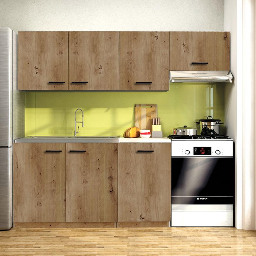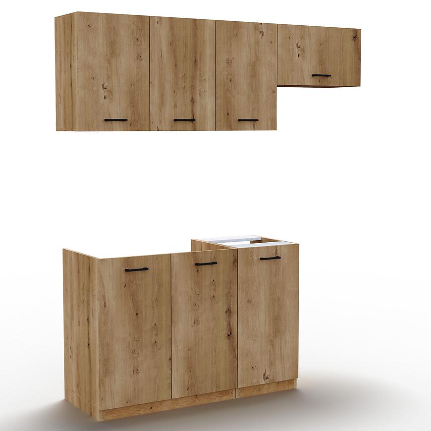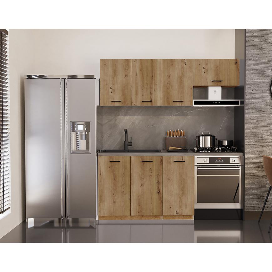Fronty, wykonane z płyty wiórowej laminowanej, prezentują się niezwykle stylowo, nadając kuchni nowoczesny i elegancki wygląd. Wybarwienie frontów górnych w jasnym drewnopodobnym odcieniu dąb artisan harmonizuje z kolorystyką frontów szafek dolnych oraz korpusu, tworząc spójną kompozycję.