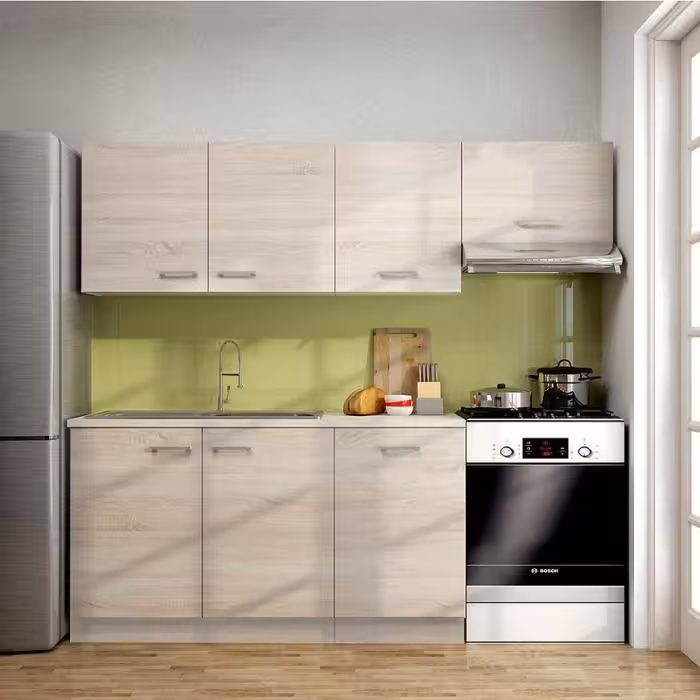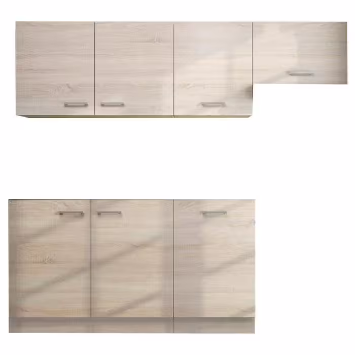 Kuchnia Ewa to zestaw mebli w kolorze dąb sonoma z uchwytami. Został wykonany z płyty wiórowej laminowanej, które nadadzą każdemu wnętrzu nowoczesności. W zestawie zastosowano proste lekkie bryły z klasyczną kolorystyką. Gotowy zestaw mebli kuchennych to dobry sposób na estetyczne, szybkie i funkcjonalne umeblowanie kuchni. Zestaw obejmuje górne i dolne szafki kuchenne wykonane z wysokiej jakości trwałych materiałów, co podczas użytkowania jest bardzo ważne.