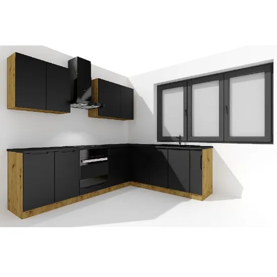 Kolorystyka zestawu łączy głęboki matowy czarny (fronty górne i dolne) z jasnym, drewnopodobnym odcieniem „artisan” (korpus). Każdy szczegół jest starannie dobrany: fronty matowe, korpus również w wykończeniu matowym – dla subtelnej elegancji bez zbędnych połysków.
