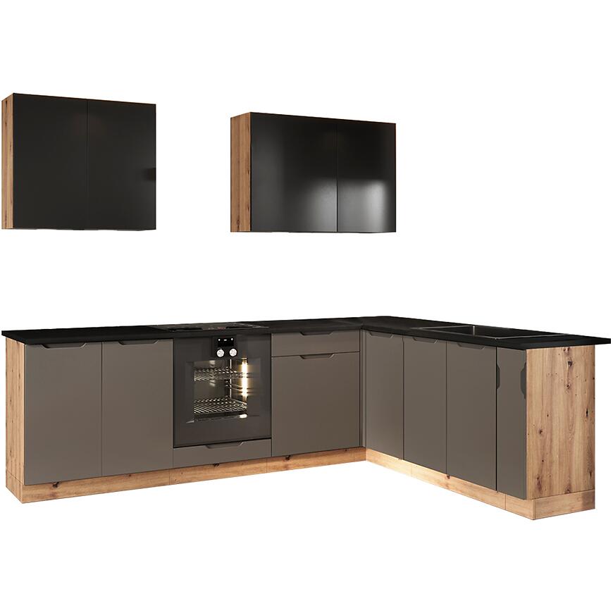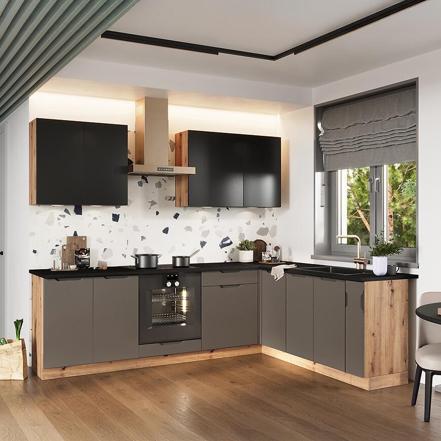 Kuchnia Isabel to idealny wybór dla osób, które cenią nowoczesny design, wysoką jakość materiałów i funkcjonalne rozwiązania w przestrzeni kuchennej. Zestaw narożny w kolorach czarny groszek, mocca grey i dąb artisan pozwala stworzyć elegancką kuchnię dopasowaną do indywidualnych potrzeb. Matowe fronty bez uchwytów i ciemny korpus tworzą harmonijną kompozycję, a praktyczne wymiary szafek zapewniają komfort codziennego użytkowania.