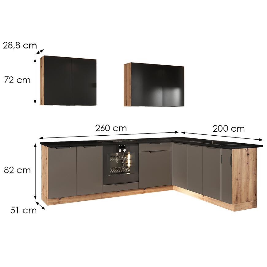 Kuchnia Isabel to narożny zestaw kuchenny dostępny w szerokościach 200/260 cm, który łączy elegancję z funkcjonalnym układem przestrzeni. Zestaw został zaprojektowany dla osób poszukujących nowoczesnego wyglądu w kuchni, łącząc matowe fronty w kolorach czarny groszek (szafki górne) i mocca grey (szafki dolne) z ciemnym drewnopodobnym korpusem w odcieniu dąb artisan. Kuchnia Isabel wyróżnia się minimalistycznym designem – brak uchwytów nadaje meblom elegancki i spójny wygląd, a matowe wykończenie frontów podkreśla nowoczesny charakter wnętrza.