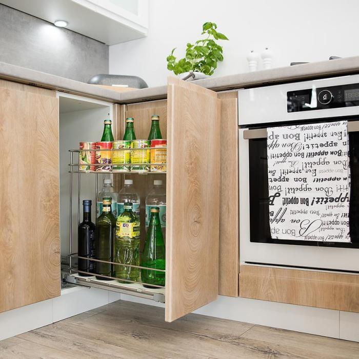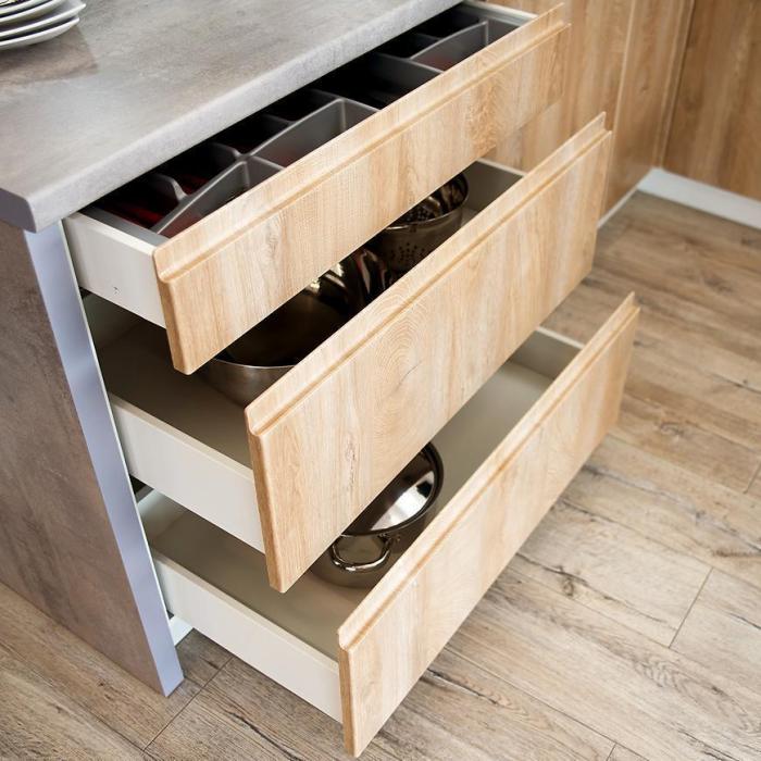 Zestaw jest świetnym rozwiązaniem, pozwoli przeprowadzić nawet szybką metamorfozę. Kolekcja obejmuje zarówno szafki z otwieranymi, uchylnymi drzwiami oraz szafki wyposażone w szuflady - zarówno jedne i drugie znajdują swoje zastosowanie w kuchni.