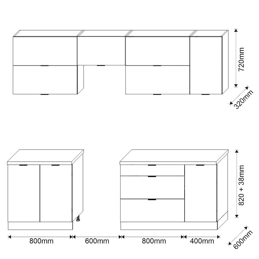 Zestaw obejmuje szafki górne o szerokościach 80, 60, 80 i 40 cm oraz szafki dolne o tych samych wymiarach. Głębokość szafek górnych wynosi 30 cm, natomiast dolnych 52,5 cm, co pozwala na wygodne przechowywanie garnków, naczyń i drobnych sprzętów kuchennych. Blat w zestawie o grubości 3,8 cm i głębokości 60 cm w kolorze dąb craft nie tylko podkreśla estetykę kuchni, ale także jest praktyczny w codziennym użytkowaniu. Blat jest jednolity dla wszystkich szafek dolnych, co ułatwia montaż i utrzymanie czystości.