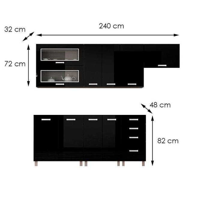 Kuchnia Lucjan to zestaw mebli w kolorze czarnym z uchwytami. Front został wykonany z płyty wiórowej laminowanej, a korpus to płyta laminowana, które nadadzą każdemu wnętrzu nowoczesności. W zestawie zastosowano proste lekkie bryły z klasyczną kolorystyką. Gotowy zestaw mebli kuchennych to dobry sposób na estetyczne, szybkie i funkcjonalne umeblowanie kuchni. Zestaw obejmuje górne i dolne szafki kuchenne wykonane z wysokiej jakości trwałych materiałów, co podczas użytkowania jest bardzo ważne.