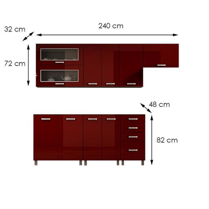 Kuchnia Lucjan to zestaw mebli w kolorze czerwonym z uchwytami. Front został wykonany z płyty wiórowej laminowanej, a korpus to płyta laminowana, które nadadzą każdemu wnętrzu nowoczesności. W zestawie zastosowano proste lekkie bryły z klasyczną kolorystyką. Gotowy zestaw mebli kuchennych to dobry sposób na estetyczne, szybkie i funkcjonalne umeblowanie kuchni. Zestaw obejmuje górne i dolne szafki kuchenne wykonane z wysokiej jakości trwałych materiałów, co podczas użytkowania jest bardzo ważne.