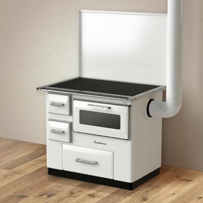 Funkcjonalna kuchnia, na której możesz gotować, piec oraz którą możesz ogrzać pomieszczenie. Palenisko wyłożone jest szamotem. Kuchnia posiada szufladę do przechowywania drewna, żaroodporne szkło w technologii „czysta szyba” oraz pokrywę na płytę grzewczą.