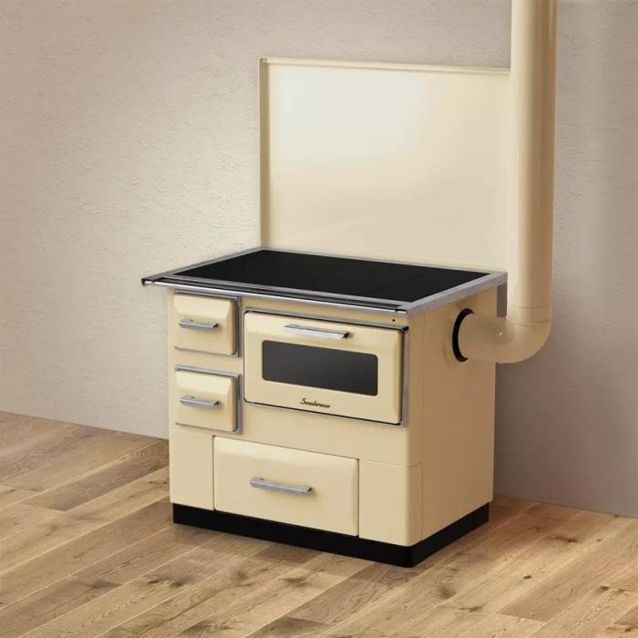 Palenisko kuchni wyłożone jest szamotem. Kuchnia posiada żaroodporne szkło w technologii „czysta szyba”, szufladę na drewno oraz pokrywę na płytę grzewczą.