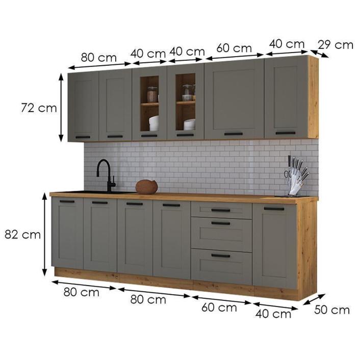 Zestaw jest świetnym i funkcjonalnym rozwiązaniem, pozwoli przeprowadzić szybką metamorfozę Twojego wnętrza. Kolekcja obejmuje szafki z otwieranymi, uchylnymi drzwiami oraz szafki wyposażone w szuflady - zarówno jedne i drugie znajdą swoje zastosowanie w kuchni.