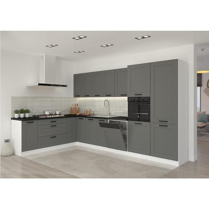 Zestaw mebli kuchennych LUNA w kolorze frontu dustgrey z matowym wykończeniem, korpus w kolorze białym idealnie wpisze się w aranżację pomieszczeń w stylu tradycyjnym i nowoczesnym.