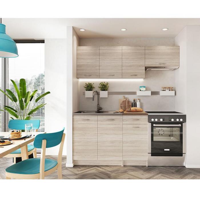 Minimalistyczna, klasyczna kuchnia Mela w kolorze dąb sonoma wpisze się w aranżację pomieszczeń w stylu nowoczesnym czy klasycznym. Zestaw posiada blat kuchenny w kolorze petra beż o głębokości 60 cm i grubości 2,8 cm, który wpisze się w klimat pomieszczenia.