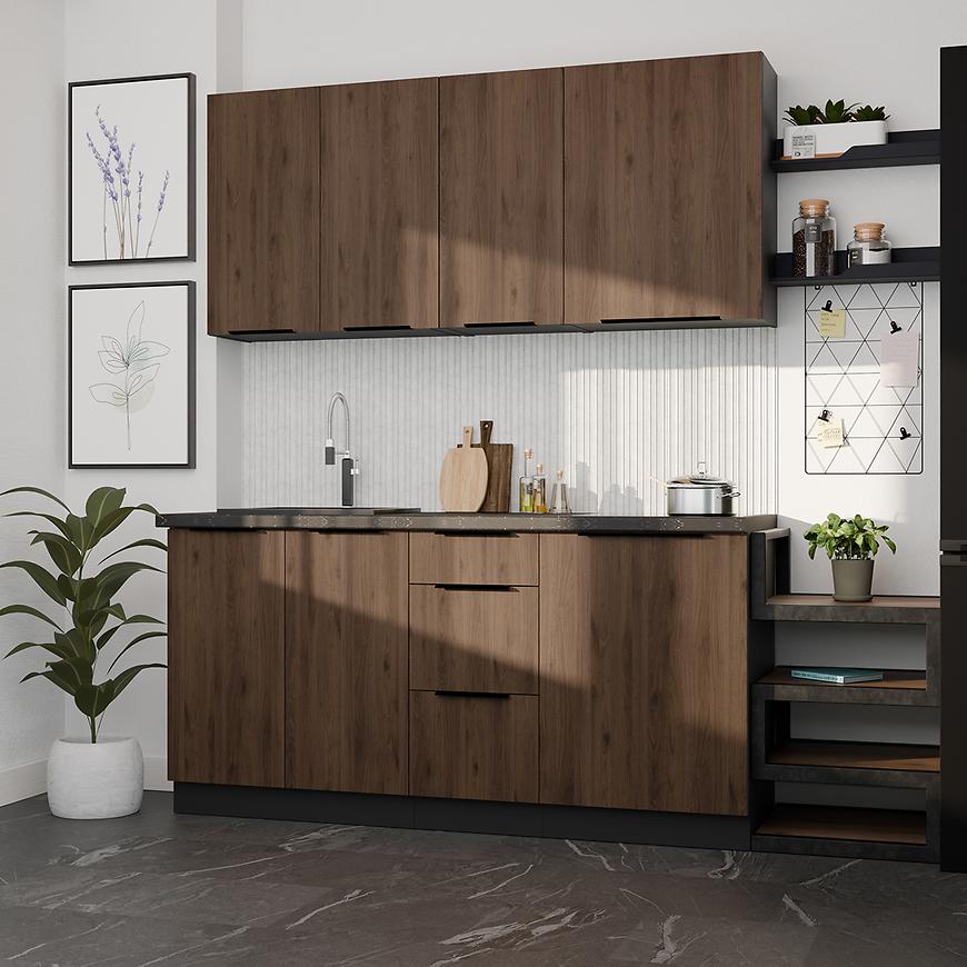 Ciemne drewnopodobne fronty w zestawie Monza nadają wnętrzu ciepła, a czarny korpus tworzy kontrast, który podkreśla nowoczesny design. Matowa powierzchnia szafek jest odporna na zarysowania i łatwa w utrzymaniu czystości. W połączeniu z funkcjonalnym układem szafek, kuchnia Monza łączy elegancję z praktycznością.