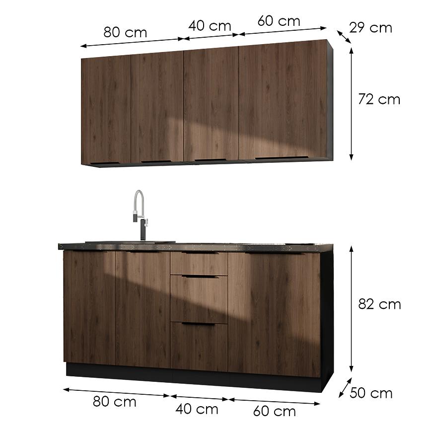 Zestaw ma wysokość 200 cm, głębokość 52 cm oraz szerokość 180 cm. Szafki górne mają wysokość 72 cm i szerokości 80, 40 i 60 cm, a szafki dolne bez blatu mierzą 82 cm wysokości. Głębokość szafek górnych wynosi 29 cm, a dolnych 50 cm. Dzięki temu kuchnia oferuje dużo przestrzeni do przechowywania, nawet w ograniczonym metrażu.