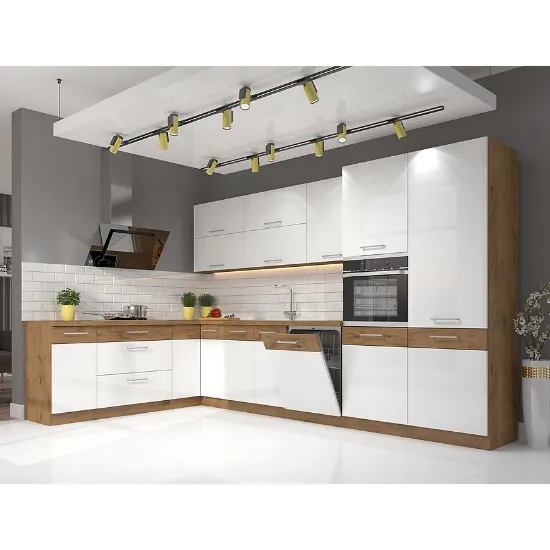 Kuchnia narożna Vigo Biały/Lancelot o wymiarach 210x350 cm to nowoczesne rozwiązanie łączące elegancki styl z dużą funkcjonalnością. Górne szafki w wykończeniu o wysokim połysku w kolorze białym dodają wnętrzu świeżości i rozświetlają przestrzeń, podczas gdy dolne szafki o matowym korpusie w odcieniu dąb lancelot podkreślają przytulny, ciepły charakter kuchni. Dzięki tej harmonijnej kompozycji kolorów, kuchnia Vigo idealnie wkomponuje się zarówno w nowoczesne, jak i klasyczne aranżacje wnętrz.