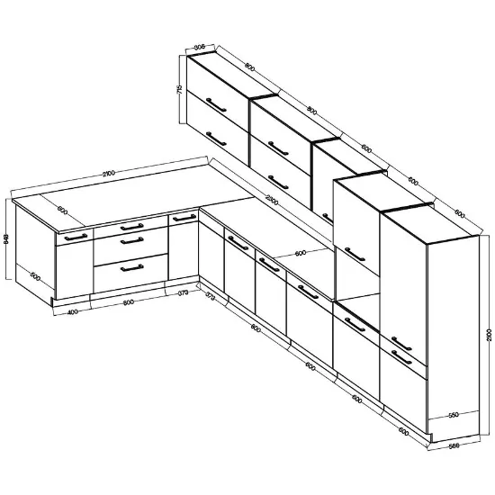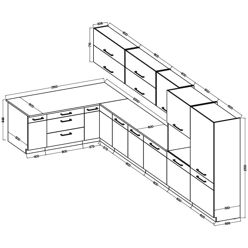 Zestaw kuchenny składa się z szafek: 40D 1F BB, 80D 3S BB, 90X90ND 2F BB, 80ZL 2F BB, FRONT ZM 713X596, 60DP-210 2F, 60DK-210 2F, 80GU-72 2F, 80GU-72 2F, 60G-72 1F oraz blatów DĄB LANCELOT 28mm długości 210cm i 170cm.