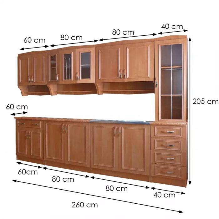 Klasyczna kuchnia Olek w kolorze olcha wpisze się w aranżację pomieszczeń w stylu tradycyjnym, klasycznym. Zestaw posiada blat kuchenny w kolorze Alhambra mat o głębokości 60 cm i grubości 2,8 cm, który wpisze się w klimat pomieszczenia.