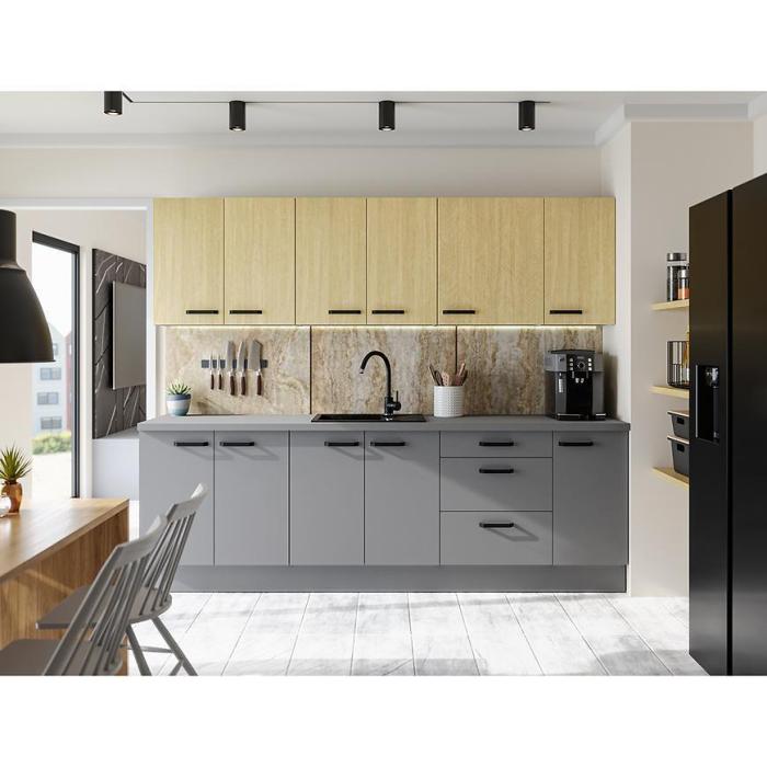 Zestaw mebli kuchennych SCANDI/NESSA w kolorze frontu jasne drewnopodobne/antracyt z matowym wykończeniem, korpus w kolorze antracyt idealnie wpisze się w aranżację pomieszczeń w stylu tradycyjnym i nowoczesnym.