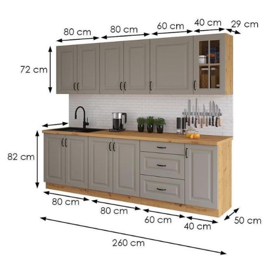 Zestaw jest świetnym i funkcjonalnym rozwiązaniem, pozwoli przeprowadzić szybką metamorfozę Twojego wnętrza. Kolekcja obejmuje szafki z otwieranymi, uchylnymi drzwiami oraz szafki wyposażone w szuflady - zarówno jedne i drugie znajdą swoje zastosowanie w kuchni.