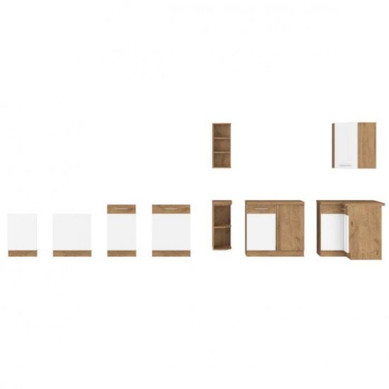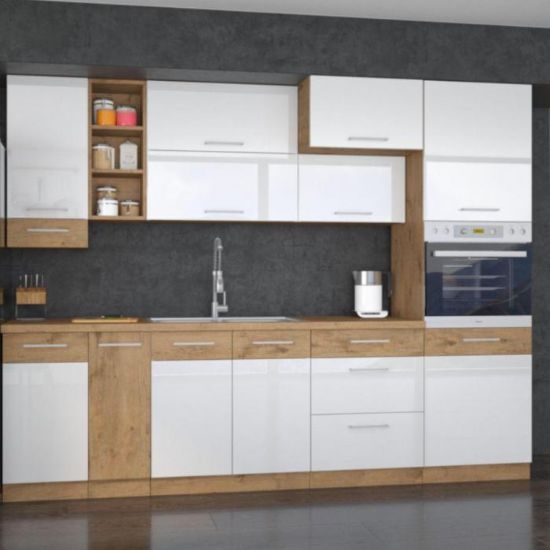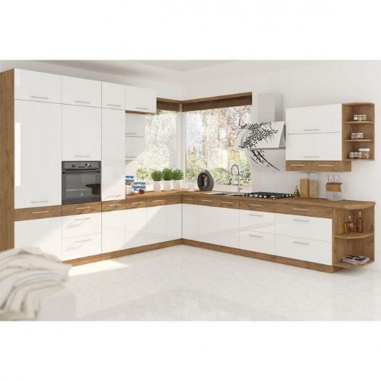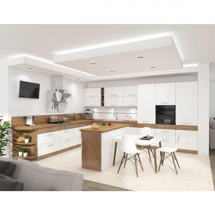 Meble kuchenne VIGO to uniwersalna propozycja dla kuchni zamkniętych oraz otwartych. Korpus wykonany z płyty wiórowej laminowanej w kolorze Dąb Lancelot. Fronty w kuchni natomiast są wykonane z płyty wiórowej laminowanej w białym połysku dodatkowo zabezpieczone folią odporną na termo warunki panujące w kuchni (ABS). Szafki wyposażone są w system cichego domyku Indamatic. Szuflady również posiadają system cichego domyku. Meble Vigo to rozwiązanie dla tych, którzy cenią sobie wygodę i indywidualny styl.