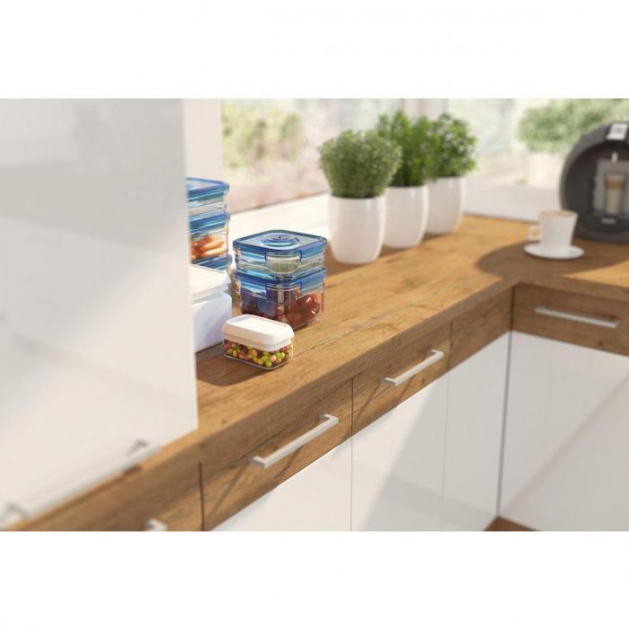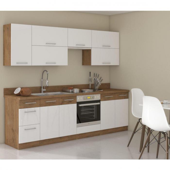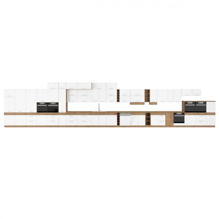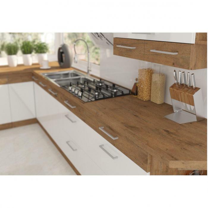 Meble kuchenne VIGO biała to uniwersalna propozycja dla kuchni zamkniętych oraz otwartych. Korpus oraz fronty wykonane z płyty wiórowej laminowanej w kolorze Dąb Lancelot. Fronty w białym połysku dodatkowo zabezpieczone folią odporną na termo warunki panujące w kuchni (ABS). Szafki wyposażone są w system cichego domyku Indamatic. Szuflady również posiadają system cichego domyku. Meble Vigo to rozwiązanie dla tych, którzy cenią sobie wygodę i indywidualny styl. Zestaw sprzedawany z blatem.