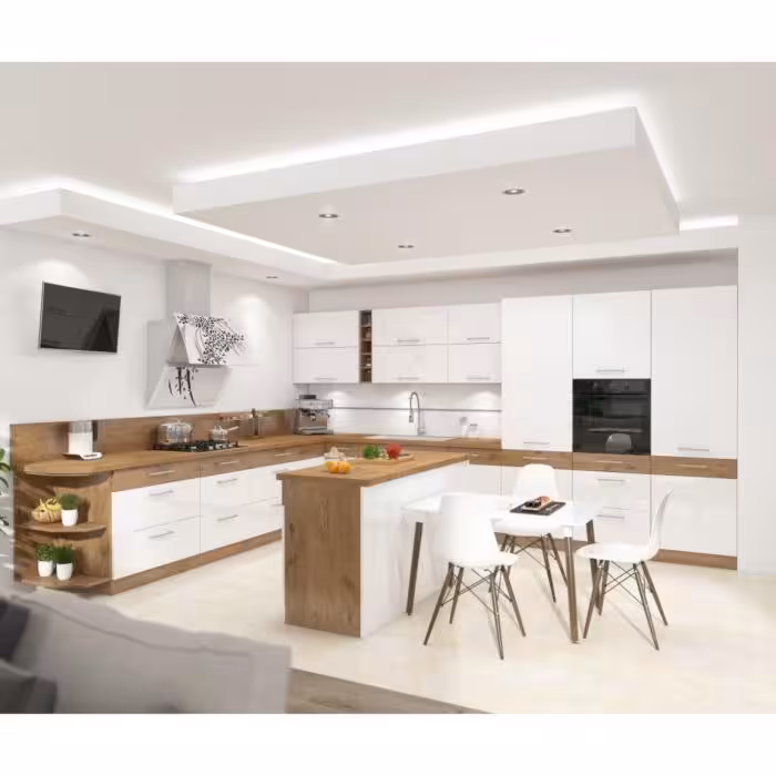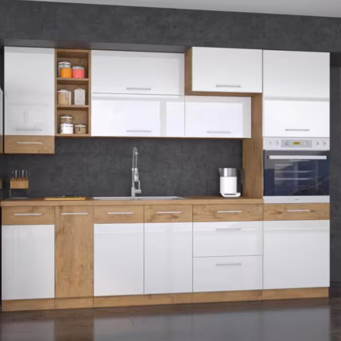 Kolekcja mebli do kuchni Vigo to harmonia stylu i funkcjonalności. Wykonane z najwyższej jakości płyty wiórowej laminowanej, te meble łączą w sobie trwałość z eleganckim wyglądem. W dekorze biały z elementami w kolorze dąb lancelot, kolekcja Vigo dodaje kuchni wyjątkowego charakteru.