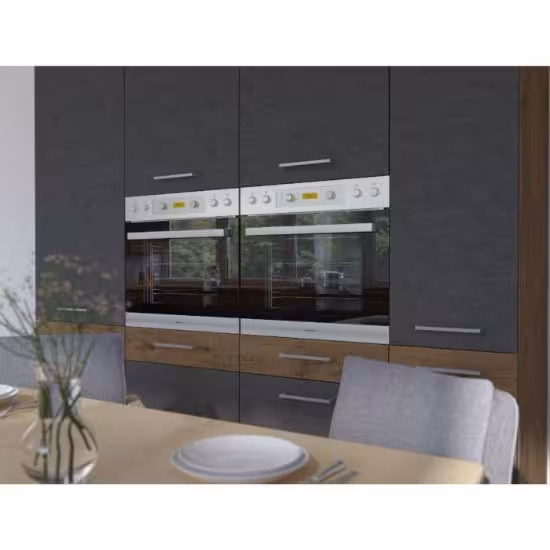 Kolekcja mebli do kuchni Vigo to harmonia stylu i funkcjonalności. Wykonane z najwyższej jakości płyty wiórowej laminowanej i MDF, te meble łączą w sobie trwałość z eleganckim wyglądem. W dekorze grafit z elementami w kolorze dąb lancelot, kolekcja Vigo dodaje kuchni wyjątkowego charakteru.