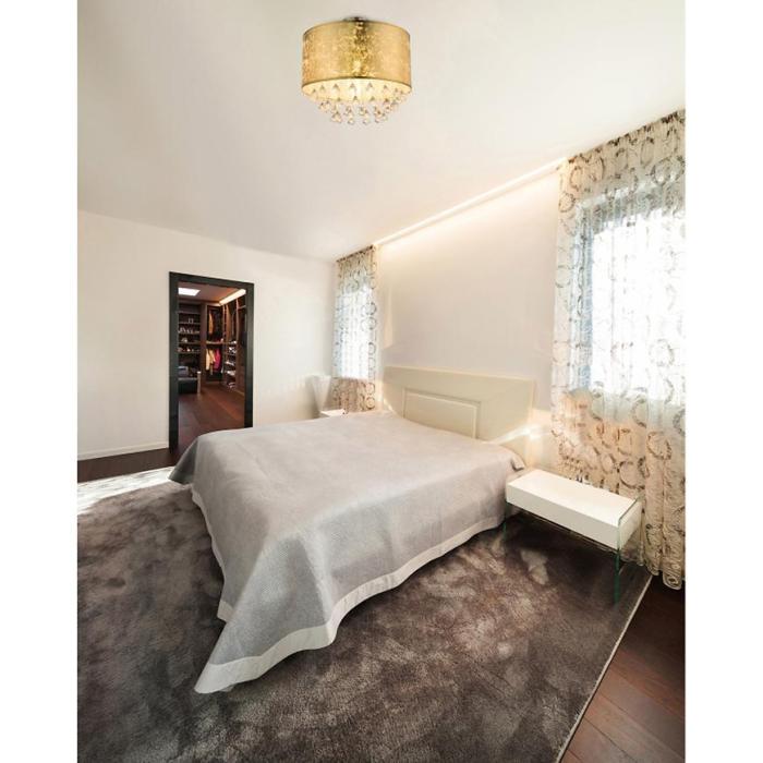 Lampa sufitowa satynowa, abażur tekstylny złoty, akrylowe kryształy czyste.