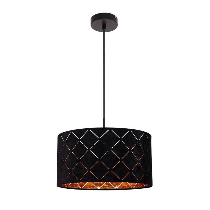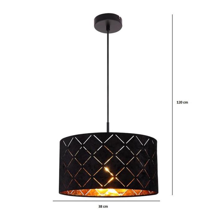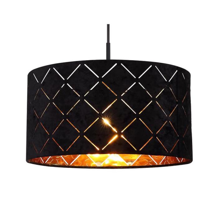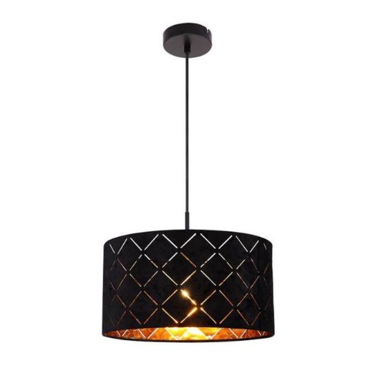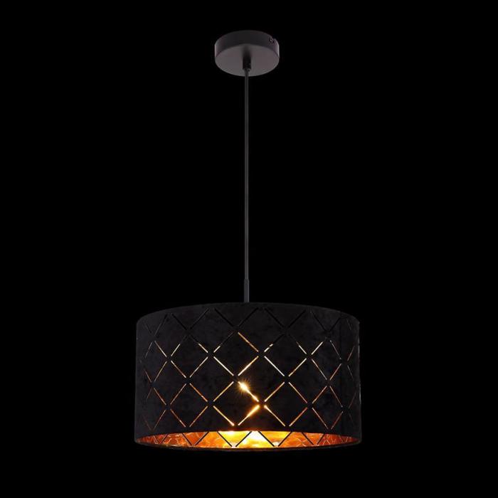 Lampa sufitowa metalowa w kolorze czarnym, tkanina czarna zewnątrz, wewnątrz złota, abażur z dekorem.