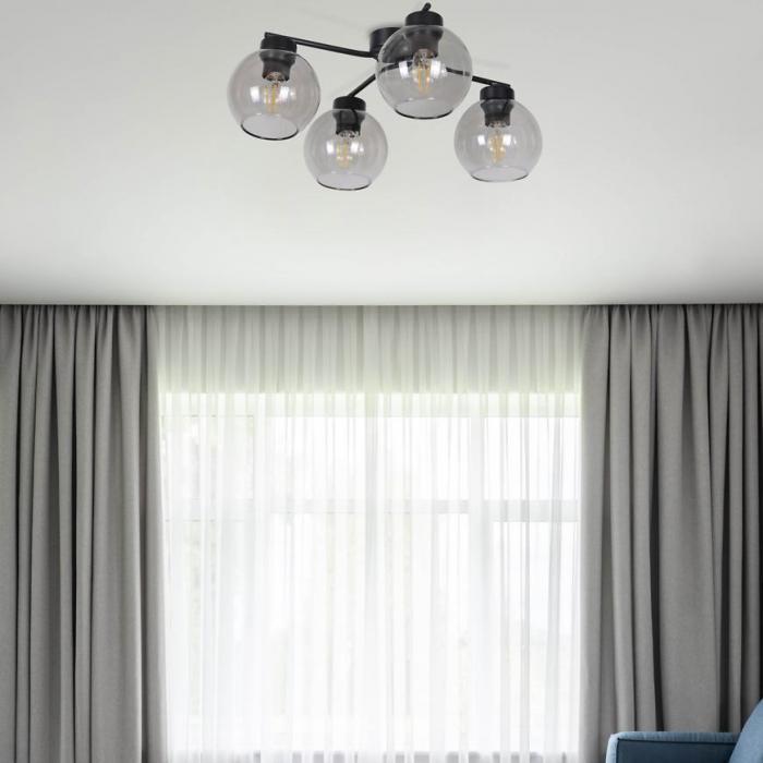 Lampa z kolekcji Aiden świetnie sprawdzi się w salonie, pokoju dziennym czy sypialni. W zależności od zapotrzebowania na moc oświetlenia, do wyboru jest konstrukcja z czterema lub dwoma kloszami. Klosze są delikatnie barwione. Zostały przytwierdzone do wygiętych, czarnych prętów, które wychodzą z okrągłej podsufitki i skierowane są ku dołowi.
